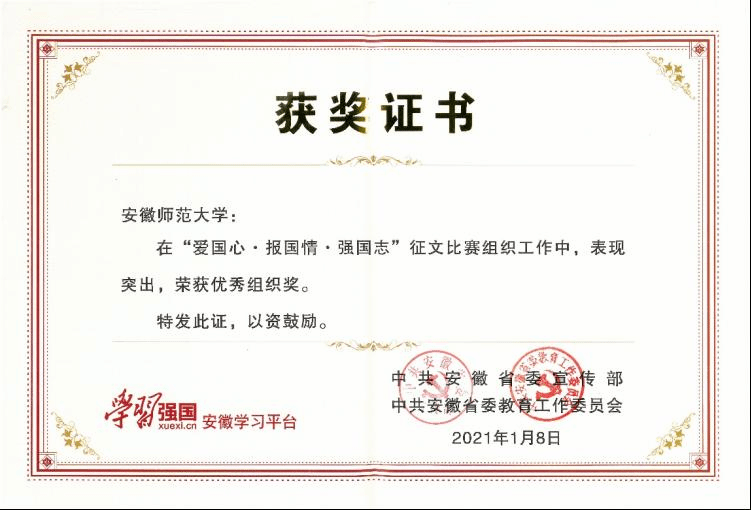 本次征文活动由安徽省委宣传部、省委教育工委牵头,以“爱国心·报国情·强国志”为主题,面向全省开展征文活动,活动旨在切实贯彻落实习近平新时代中国特色社会主义思想,特别是习近平总书记关于爱国主义教育、青少年成长成才等的重要论述,进一步引导广大青少年涵养家国情怀,坚定民族自信,积极培育社会主义核心价值观,让爱国主义精神在青少年心中牢牢扎根。