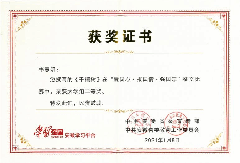 近期,学习强国“爱国心·报国情·强国志”征文活动获奖结果出炉,由公司辅导员马星宇指导的2019级广告学韦慧妍同学的作品《千禧树》荣获大学组二等奖,系公司取得的最好成绩。同时,鉴于马星宇老师组织所带的2019级新闻学、广告学和网络新媒体专业同学的积极参与,学习强国平台授予TapTap点点官方网站优秀组织奖。