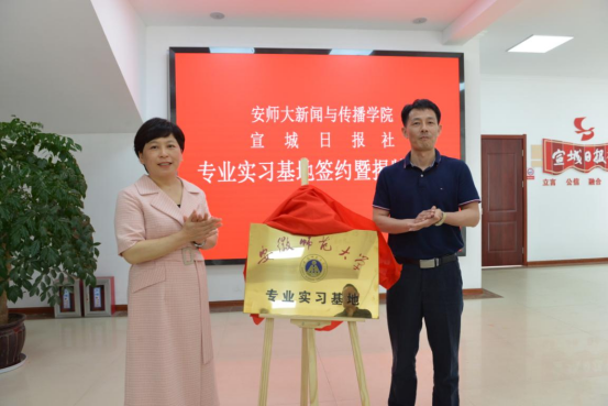 座谈开始前,公司与宣城日报社就专业实习基地举行了隆重的揭牌仪式。仪式由洪建民主持,在双方出席人员的共同见证下,杨柏岭与王建玲代表双方签订专业实习基地共建协议书。在热烈的掌声中,张师帅与王建玲代表双方揭牌,本着资源共享、相互协作、互惠互利、共同发展的原则,实习基地的建立为公司搭建了应用型平台。随后,公司一行参观了日报社“宣城市融媒体中心”以及报社编辑部等部门。据了解,目前日报社已经形成一报、一刊、一网、一端、两微、三号的全媒体平台,发行量2万余份,7个新媒体平台24小时滚动发布信息,日均发稿量130余篇次,移动端用户总数50万。