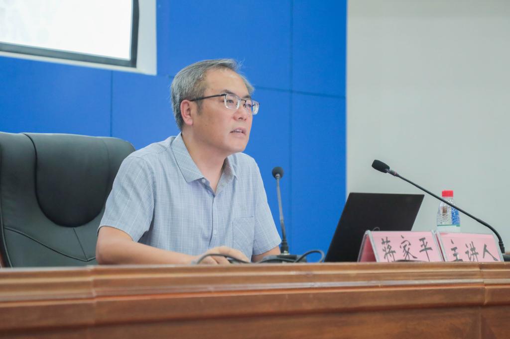 最后,蒋家平以朗诵了自己创作的词《沁园春·颂建党百年》作了结课。“盛世残年,边声四起,征鼓隆隆。恨丑夷兽舞,生民涂炭;群贤奋袂,路险途穷。呐喊摇旗,披荆窃火,卷起惊涛千万重。南湖上,小舟浮烟水,新月如弓。少年壮气如虹,死沙场、浩然天地中。喜鼎新革故,江山肃整;藩篱继启,内外融通。百岁犹晨,初心不负,俾乂斯民秉至公。复兴业,异纷纷桃可,占断春风。”这篇词生动形象地阐述了建党初期恶劣的社会环境以及中共建党所带来的开天辟地的革命形势,同时描写了一代又一代革命者的前赴后继和党在后期的发展建设,并表达了对自己对建党百年的衷心祝福。