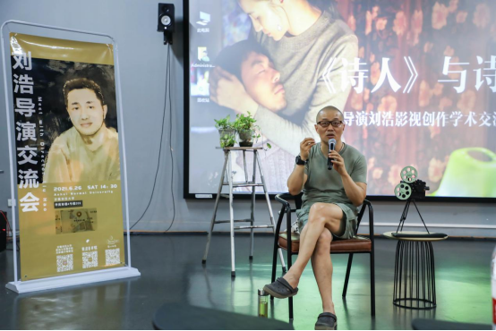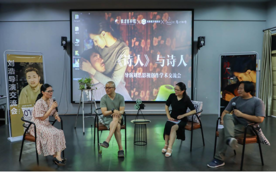 讲座伊始,马梅介绍了刘浩导演的作《陈默和美婷》《好大一对羊》《老那》《向北方》《诗人》,并感谢刘浩接受观影会活动邀请。刘浩以互动漫谈的形式进行讲解,交流的主要内容:一、拍摄关于芜湖的电影,关注江边上的故事,抓住文本自带的独特性。二、关于诗歌的式微,诗歌可能用另一种形式表达,但不会消失,每个人心中都有一首诗歌。三、关于最喜欢的导演,希腊导演西奥·安哲罗普洛斯是的电影囊括了众多面向——诗歌、文学、政治、历史,甚至包括精神层面、哲学层面的深度。四、最关注的诗人陈年喜。刘浩导演赞誉他的诗歌《炸裂志》最具有生命力。五、关于电影《诗人》记录着20世纪80年代的时代记忆。影片以平民视角与群众关怀、真实美学,将个人青春回忆、时代记忆与诗情诗意相结合,描摹了一对夫妻的“诗”与“诗意”,并以真实美学、客观视角的导演思维,将时代下淳朴、善良、热情、热血、逐梦的人物群像进行了全景式展现。随后马梅主持“诗歌、诗人与电影”对谈,刘颖从文学研究、李商雨从诗人身份分别与刘浩的诗歌、诗人影像化创作相互提问与对答。