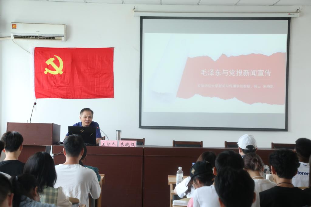 朱晓凯结合中国新闻发展史从发展阶段、主要内容、基本特点为大家讲述了毛泽东同志的基本新闻思想。他指出,毛泽东的新闻思想是在对中共领导的新闻实践活动所积累的经验教训进行深刻总结的基础上形成的,是对马克思主义新闻观的继承和发展,具有鲜明的中国特色,是新时代开展党的新闻舆论工作必须坚持的理论指南。他强调,报刊是服务党的事业的重要武器,是毛泽东办报思想的重要内容。同时,结合时代背景向大家讲述了毛泽东与党报新闻宣传的历史意义和当代价值。他在党课中以幽默风趣的语言、丰富的事迹案例讲解赢得了学员们热烈的掌声,也使得全体学员的思想水平和理论水平得到了进一步提升。