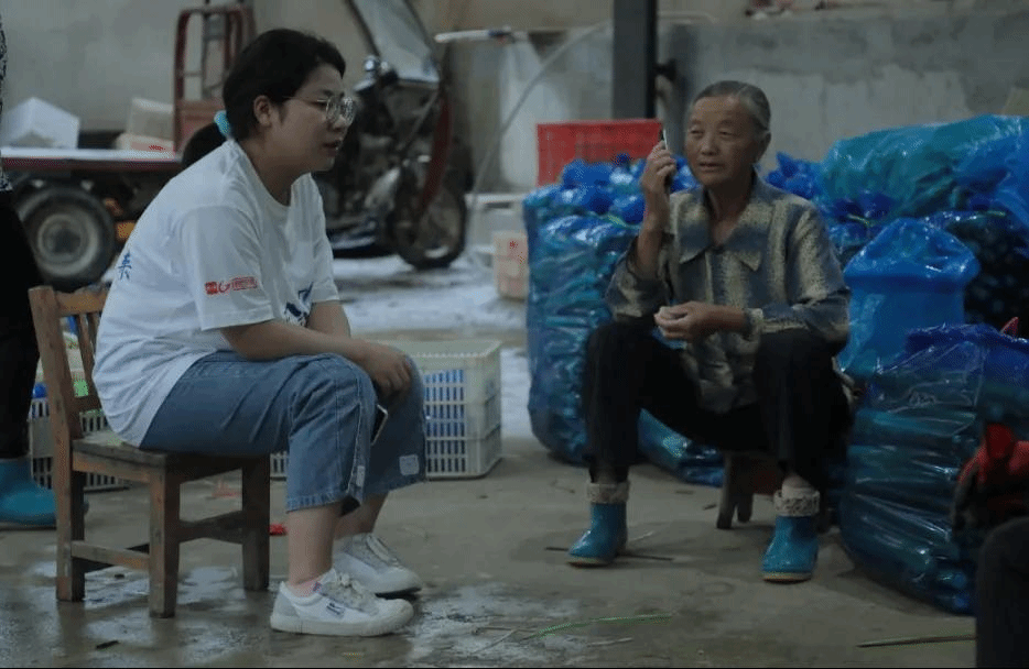 (图为金梦婷正在茭白工厂和茭白工人交谈)