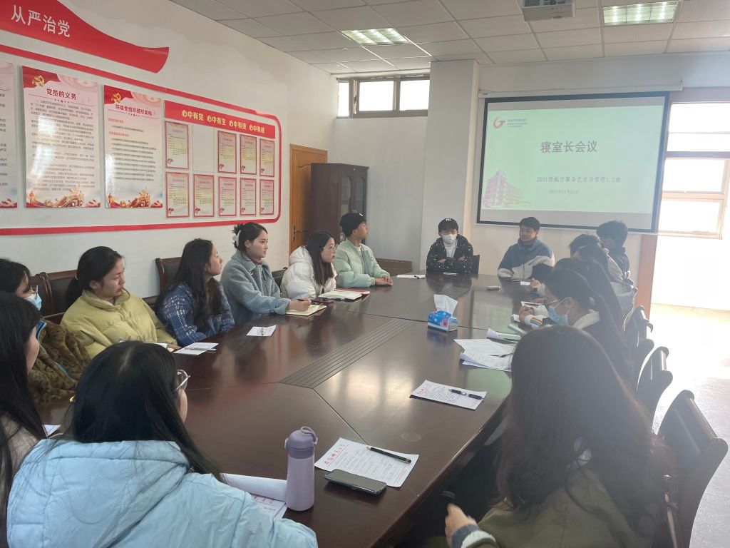 本网讯(文/姜亚杰 图/李春佳 胡欣雅)2021年11月24日上午,2021级航空服务艺术与管理专业1、2班召开全体寝室长会议,生活辅导员俞应芬、班级生活委员、安全委员参会,会议由辅导员张雁主持。