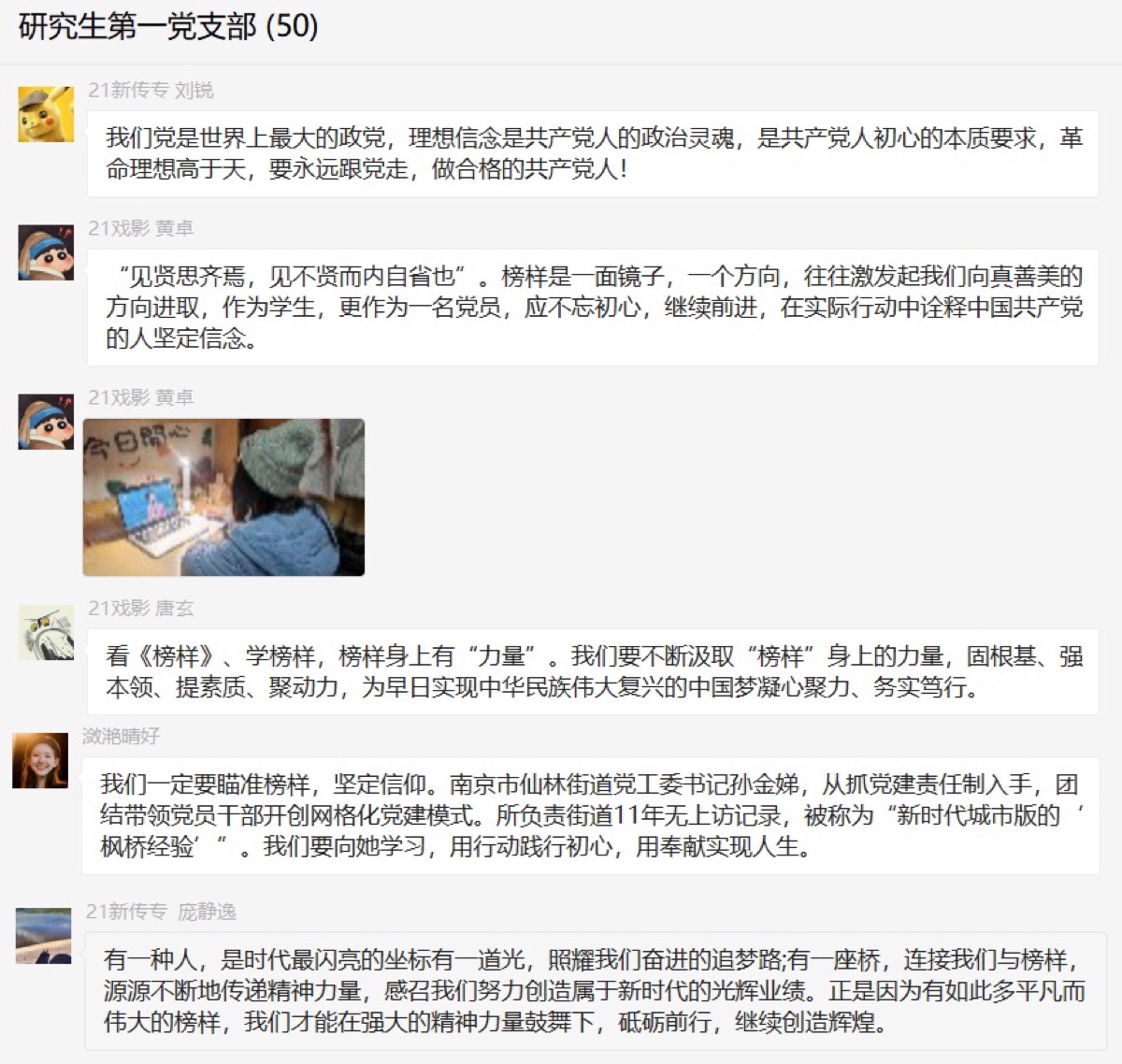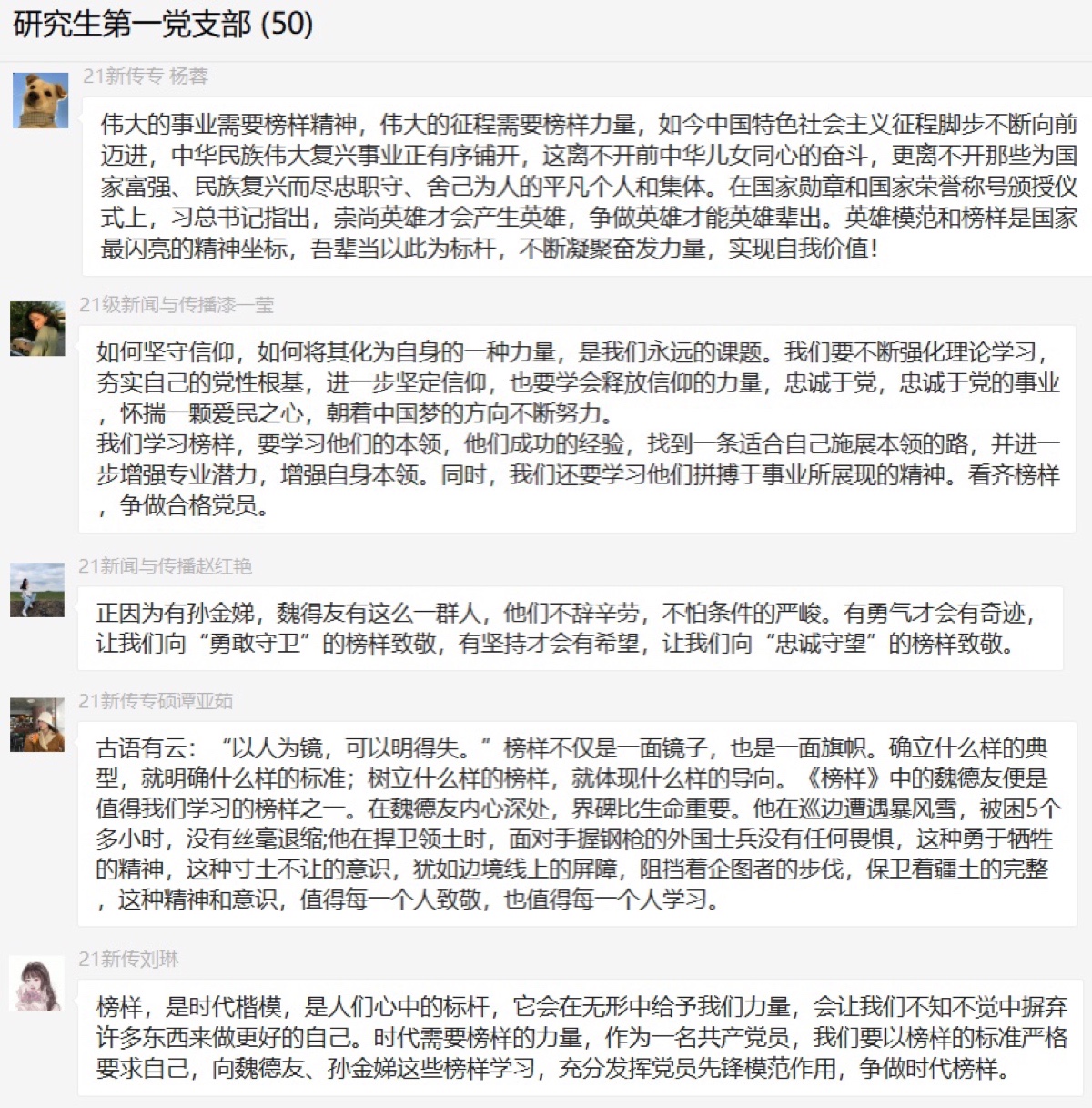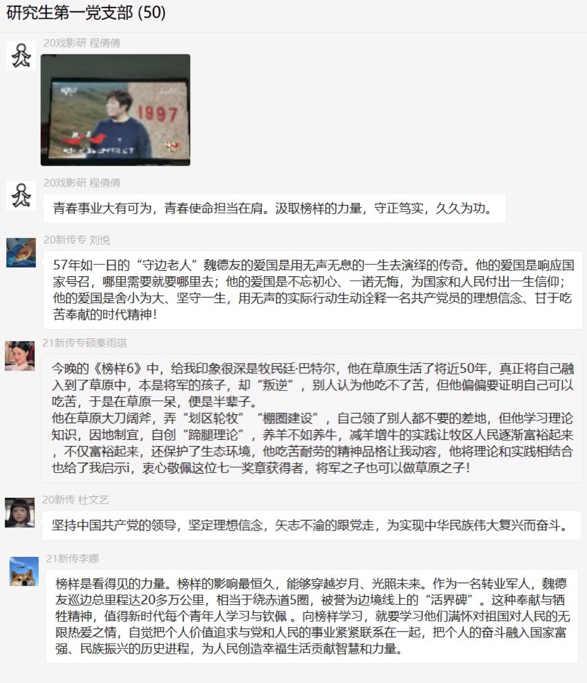 在观看《榜样6》后,同学们纷纷表达学习体会与感想。支部宣传委员刘悦同学说:“57年如一日的“守边老人”魏德友的爱国是用平凡的一生演绎的传奇。他的爱国是响应国家号召,哪里需要就到哪里去;他的爱国是不忘初心、一诺无悔,为国家和人民付出一生信仰;他的爱国是舍小为大、坚守一生,用无声的实际行动生动诠释一名共产党员的理想信念、甘于吃苦奉献的时代精神!”王海玲同学表示:“榜样有着无穷的力量,向下扎根,朝上生长,榜样最能温暖人、启迪人。作为新时代的青年共产党员,作为TapTap点点的研究生,我们会不忘初心,勇于奉献,甘于奉献,承担起中华民族伟大复兴的使命。要向榜样人物学习,比如卫国戍边英雄团长祁发宝,在与越线外军的斗争中,身先士卒,身负重伤,坚守祖国的每一寸国土,让人动容;从“将军之子”到“草原之子”,在最穷最偏远的牧区扎根,带领乡亲们共同致富的“七一勋章”获得者,有“草原之子”之称的廷·巴特尔令人敬佩……优秀人物就是我们学习的榜样,是激发我们前进的动力!”张云同学认为:“时代前进需要积极向上的道德风尚来引领,社会发展需要道德楷模的力量来推动。他们的高尚品德,温暖了人心,感动了中国,为全社会树立了榜样。魏德友便是我们的榜样之一。在平凡而又伟大的53年里,魏德友始终不忘初心,坚持为国戍边信念,与妻子一起驻守在夏季蚊虫肆虐、冬季风雪埋人的无人区,过着‘家住路尽头,放牧为巡边’的生活,书写了西陲戍边半世纪。在实现中华民族伟大复兴中国梦的征途中,我们会向时代楷模看齐,永不言弃!”杨韵箫同学说:“孙金娣、魏得友等人作为基层模范先锋代表,已经将党员的先锋模范作用不断发扬光大,他们就是我们的榜样,我们要追的星。中国共产党的初心和使命,就是为中国人民谋幸福,为中华民族谋复兴。这个初心和使命是激励中国共产党人不断前进的根本动力。全党同志一定要永远与人民同呼吸、共命运、心连心,永远把人民对美好生活的向往作为奋斗目标,以永不懈怠的精神状态和一往无前的奋斗姿态,继续朝着实现中华民族伟大复兴的宏伟目标奋勇前进……”周晓庆同学表示:“观看《榜样》,学习优秀共产党员的先进事迹,以强烈的标杆意识,以榜样为鉴,学榜样,向榜样看齐。‘动人以言者,其感不深;动人以行者,其应必速。’《榜样》中每一个镜头、每一个场景、每一个故事,都彰显着党员的力量,展示着党员的魅力,传递着党员的正能量,让观看的人都深深地感动、折服,用平凡故事讲述深刻道理,用先进典型模范事迹诠释党的崇高理想,展现了一代又一代共产党人不忘初心的执着和坚守。”