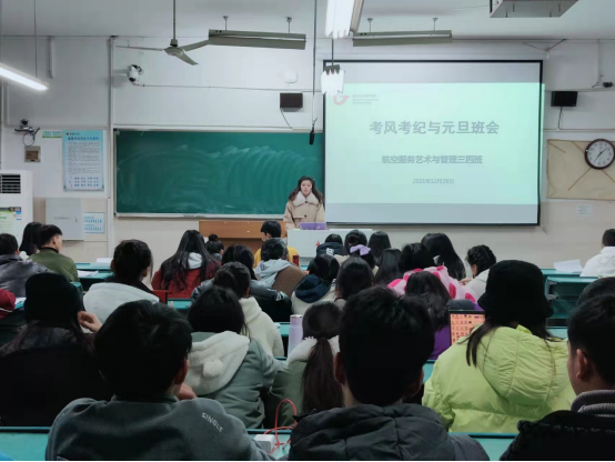 在期末考试来临之际,为端正考风考纪,加强学风建设,2021年12月31日,21级航服3、4班在行知楼2050505室召开了考风考纪主题班会。