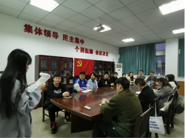 11月19日,新闻与播音主持本科生党支部在公司四楼会议室召开了支部转正大会,讨论预备党员赵梦婷、尹佳、徐子逸3名同志的转正事宜,会议由支部书记马星宇主持,支部所有正式党员和在校预备党员参加。