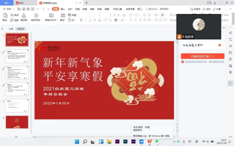 会上,杨韵箫老师就开学报到时间、注意情况,第三轮选课要求,上学期成绩复查,寒假作业提交等工作做了详细布置,重点强调了安全工作,要求同学们一定要注意疫情防控,严格落实防疫要求,坚持每天按时打卡,切实做好返校路途自我防护。