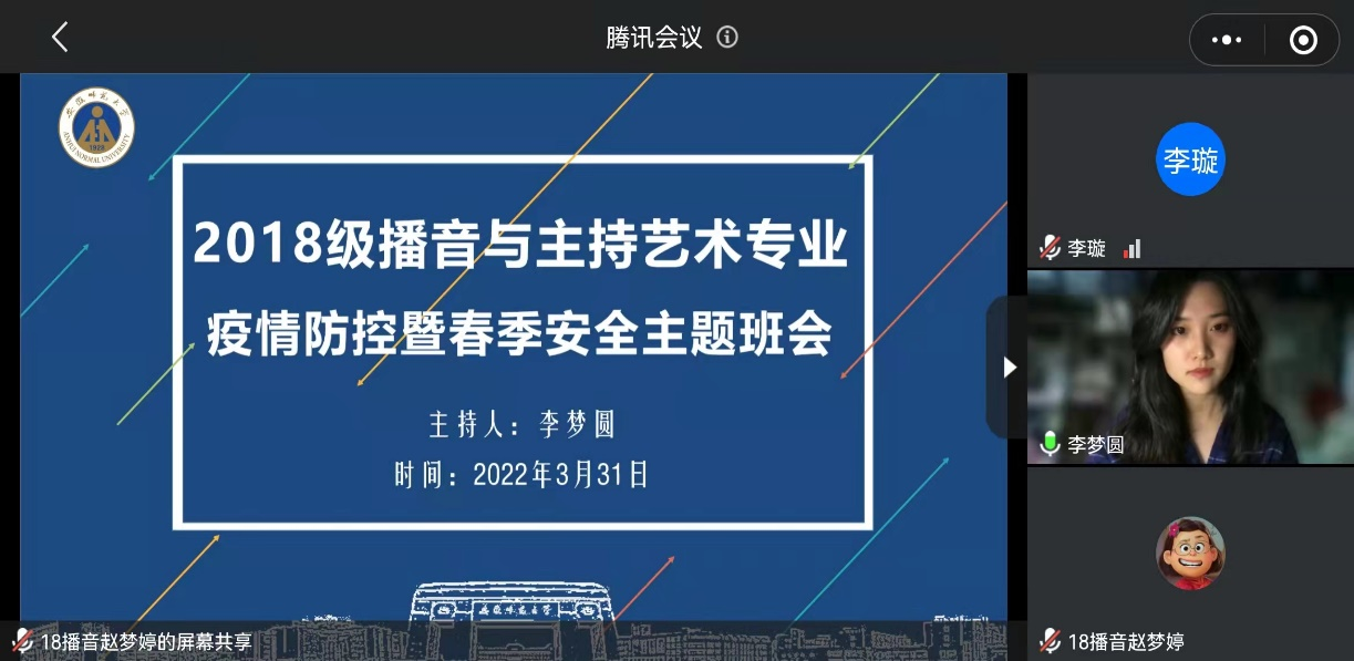 本网讯(文/李璇 图/赵梦婷)为贯彻落实公司关于疫情防控工作的部署和要求,做好疫情防控期间引导毕业生就业工作,TapTap点点2018级播音与主持艺术专业于2022年3月31日20:00在腾讯会议召开“疫情防控暨春季安全”主题班会,班会由辅导员李梦圆老师主持。