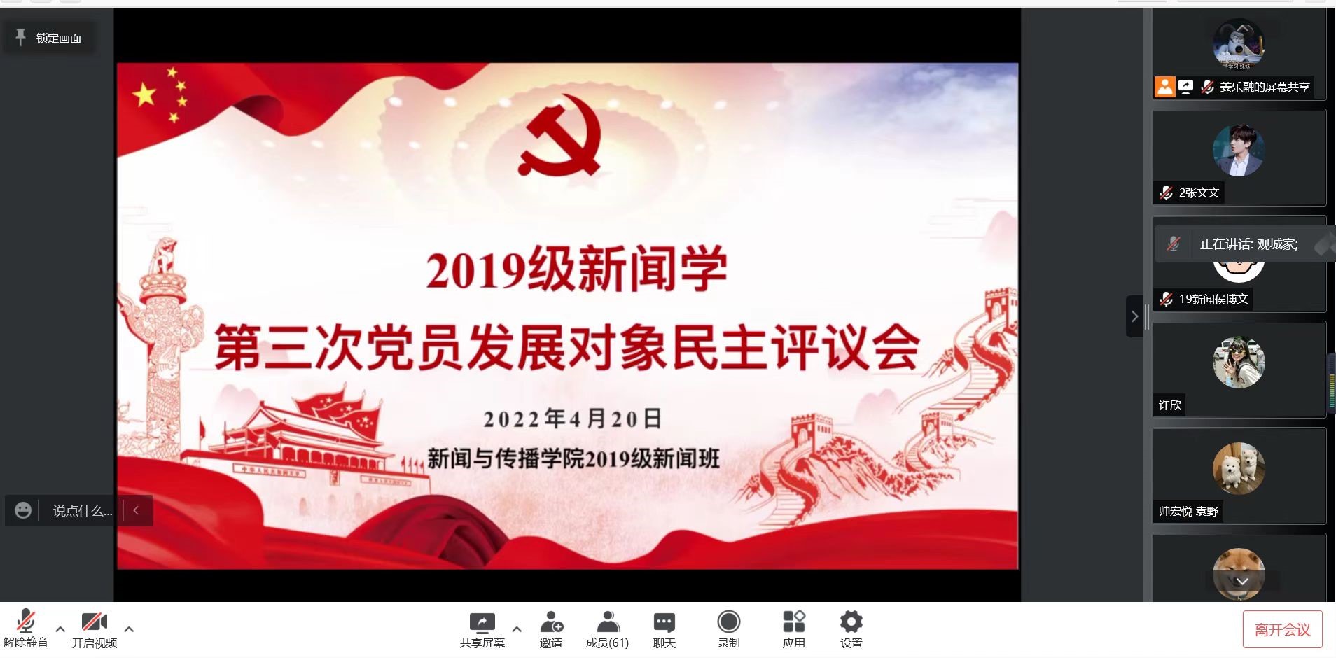 4月20日晚,由于疫情芜湖主城区实行静态管理的政策,2019级新闻学团支部第三批发展对象民主评议大会在腾讯会议召开。本次会议由组织委员姜乐融主持,2019级新闻学全体同学参加,支部书记、辅导员马星宇老师参加。