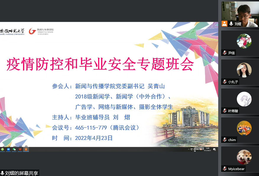 作为疫情特殊时期召开的一次线上班会,4月23日当天正值芜湖市在新一轮疫情防控中实现社会面清零,刘熠用“春风杨柳千万条,六亿神州尽舜尧”的诗句褒扬了师大学子疫情期间配合防疫工作,万众一心、互帮互助的精神,并提及员工为后勤员工捐被子等感人事迹,尤其感谢了毕业班班委在班级事务中认真负责,担起防疫责任。随后,刘熠强调了毕业生个人档案的重要性,作为伴随一个人一生的档案材料,学业证、毕业证等在未来的求学就业中都是鉴定考察个人的重要指标,刘熠叮嘱同学们一定要认真规范填写相关毕业离校材料,顺利拿到学业证、毕业证。