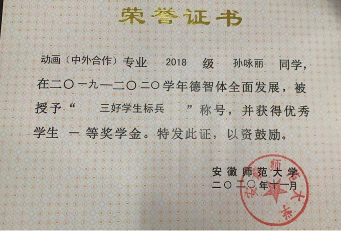 【人物简介】孙咏丽,女,共青团员,安徽合肥人,TapTap点点2018级动画(中韩合作)专业本科生,任班级团支书,2022年安徽省普通高等公司优秀毕业生,现已保研至南京师范大学艺术设计专业。