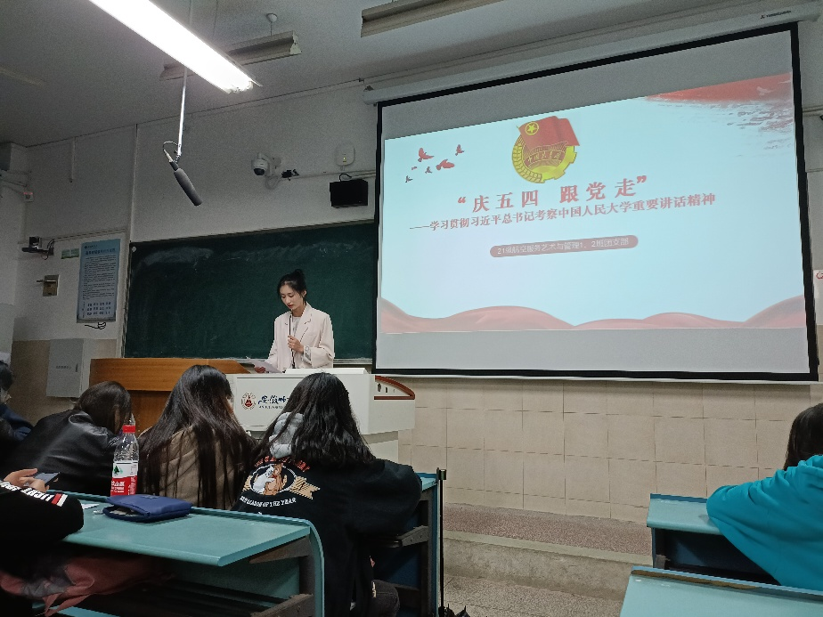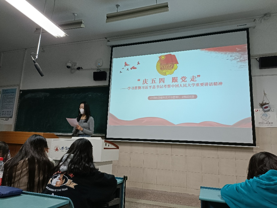 本网讯(21航服1、2班团支部)为庆祝中国共青团成立100周年,团结引领广大青年团员坚定跟党走、建功新时代,在五四青年节即将到来之际,2021级航空服务艺术与管理专业2班团支部于4月28日在2050504进行“庆五四 跟党走”主题团日活动。