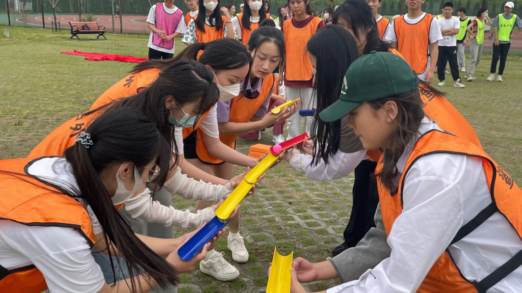 首先进行破冰活动活跃同学们之间的气氛,不仅考验同学们的反应能力,同时也锻炼了同学们的应场能力,游戏的惩罚为我们带来了精彩的才艺表演。接着是团队文化建设和展示,自己设计队旗、队歌、口号等。后面兔子回家、能量传递、车轮滚滚、投石过河、激情节拍等环节考验了同学们之间的团结协作能力。团队中的每一个人都发挥了自己的聪明才智,团队意识和团队凝聚力得到进一步提升。