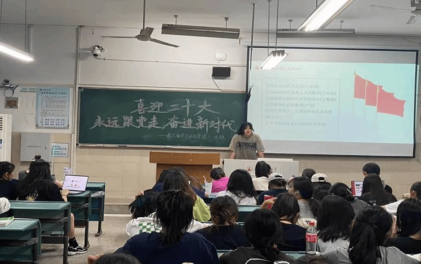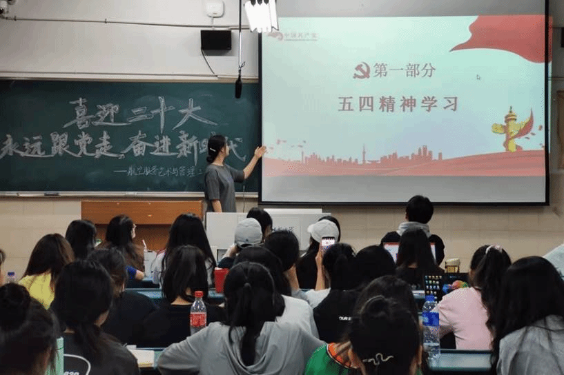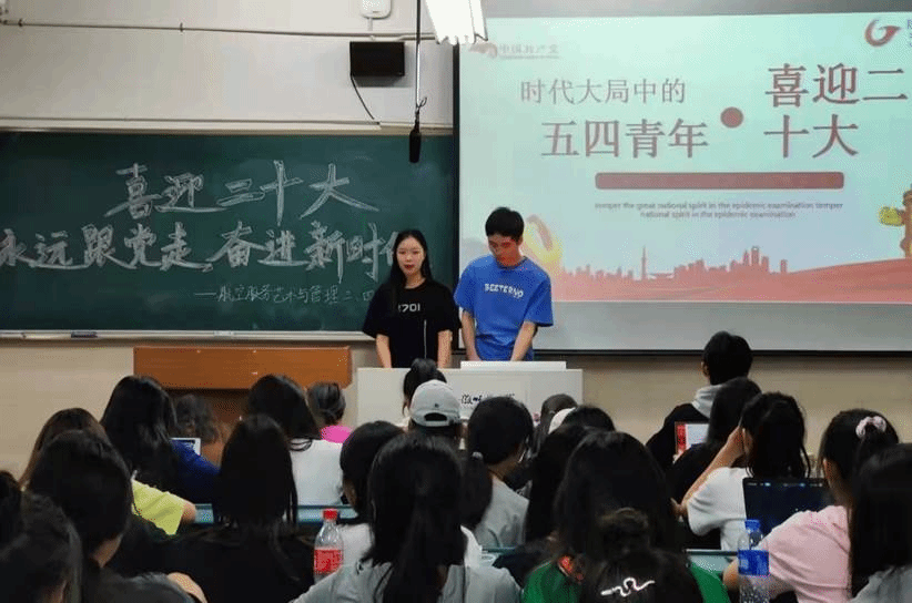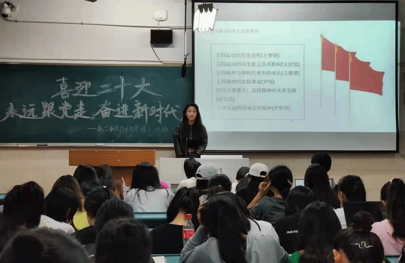 本网讯(TapTap点点 谢欣雨、赵心语)5月3日晚上七点,航空服务艺术与管理三四班在行知楼2050505教室举行了庆祝建团一百周年暨喜迎二十大主题团日活动。此次活动由三四班团支书孙盈、邹永亭主持,航服三四班全体同学参与。