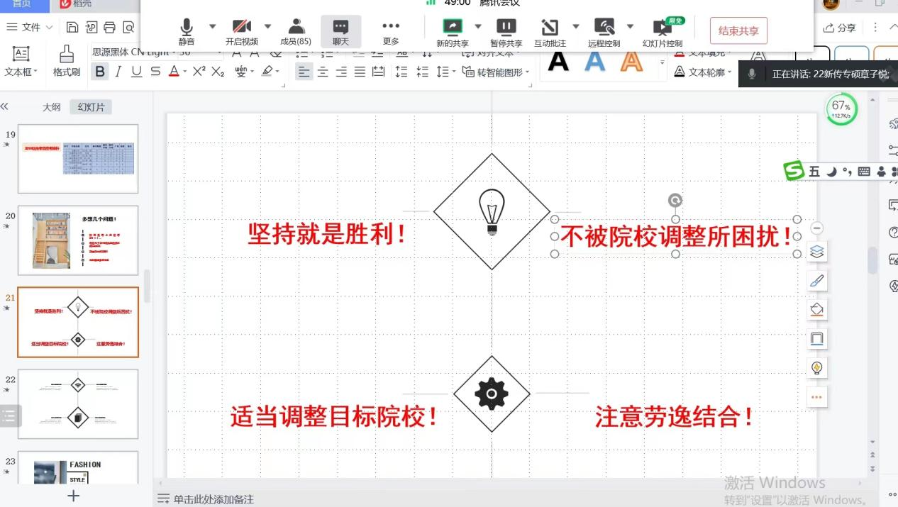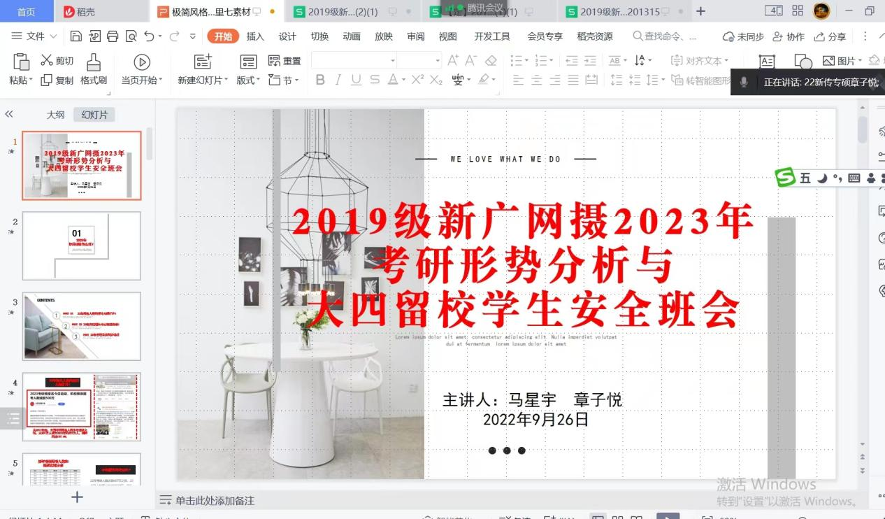 9月26日晚,2019级新闻、广告、网络与新媒体、摄影四个专业在班主任马星宇的主持下集体召开了“2023年考研形势分析与大四留校员工安全班会”。会上马星宇向同学们分析了目前的考研现状,就本阶段备考择校、复习状态做了详细梳理,并与章子悦老师就留校员工安全问题作了强调与说明。