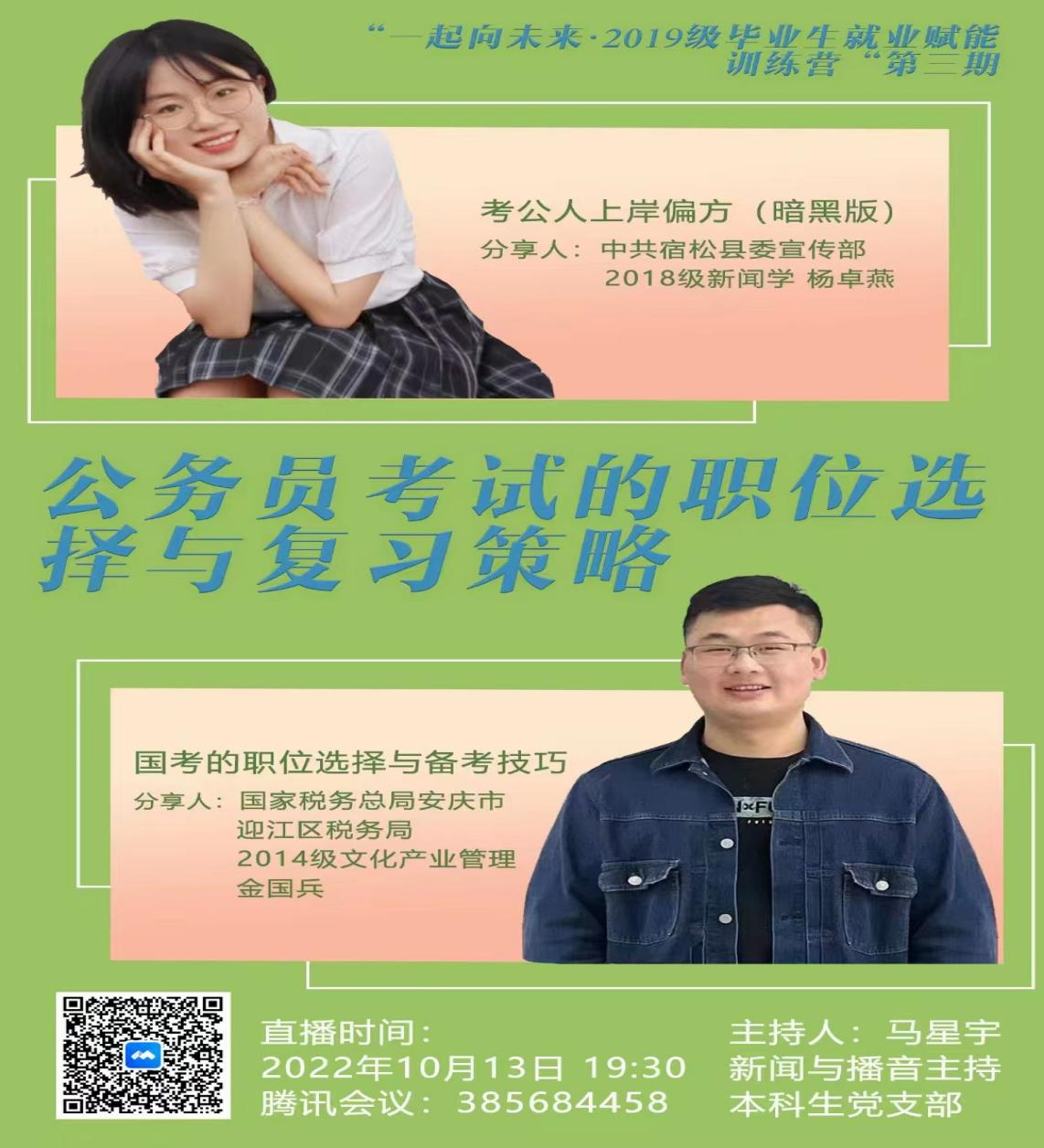 为帮助选择“考公”道路的新传学子提升实战能力,增强公司2019级毕业生“考公”上岸的信心,新闻与播音主持本科生党支部于10月13日晚举办“一起向未来·2019级毕业生就业赋能训练营”第三期培训,分别邀请到已录用为中共宿松县委宣传部公务员的2018级新闻学杨卓燕同学和安庆市迎江区国家税务局公务员的2014级文化产业管理专业金国兵同学作职位选择与备考技巧等方面培训。培训会由辅导员马星宇主持,来自2019级毕业班各专业意向“考公”同学参加培训。