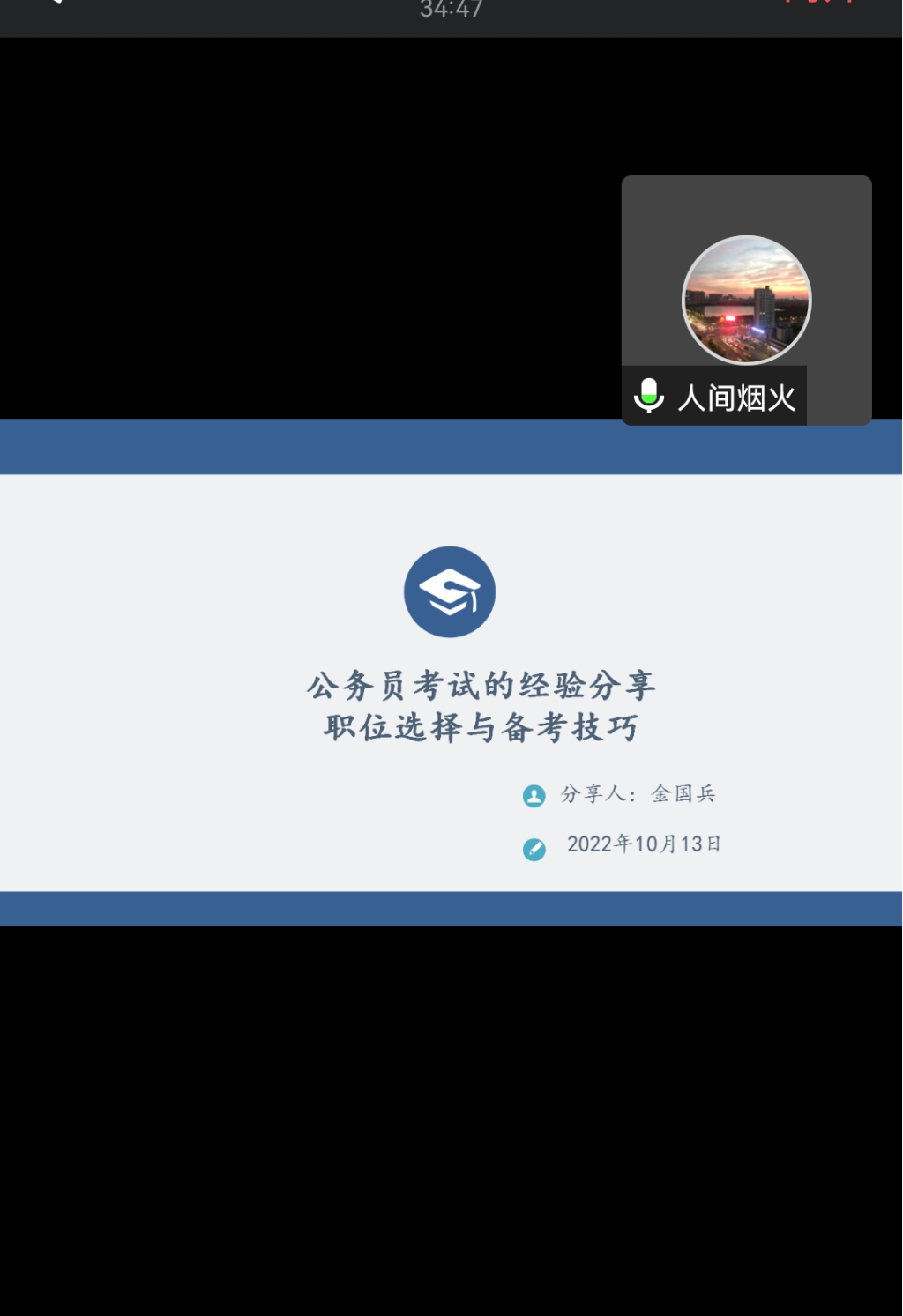 在会上,杨卓燕侧重备考时间安排和“考公”各专题模块的学习策略进行了分享,她指出“在备考过程中,跟对名师学习很重要,要对自己知识的掌握情况多次复盘,有针对性的去选择老师”。金国兵则主要针对岗位选择介绍了自己的经验,他以自身经历为例,强调大家要根据考量自身条件筛选适合自己的岗位,要对自己的岗位选择做到“心中有数”。