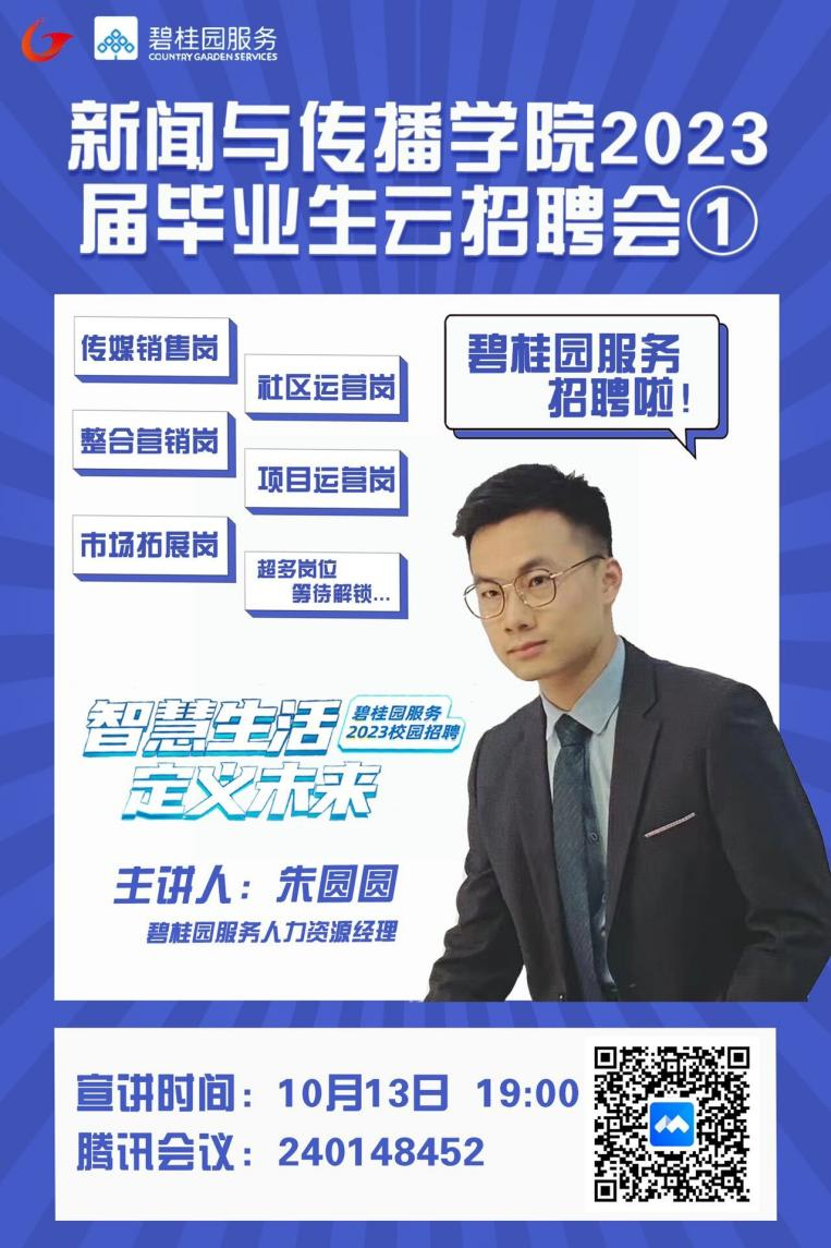 本网讯(TapTap点点 陈可月)为扩宽2023届毕业生就业渠道,加强校企联动,促进毕业生高质量就业。10月13日晚19点,TapTap点点召开2023届毕业生第一期云招聘会,此次招聘会邀请到“碧桂园服务控股有限公司”(简称碧桂园服务)人力资源部经理朱圆圆,开展以“智慧生活,定义未来”为主题的线上宣讲。会议由辅导员李露露主持,毕业班辅导员马星宇和2023届部分毕业生线上参与。