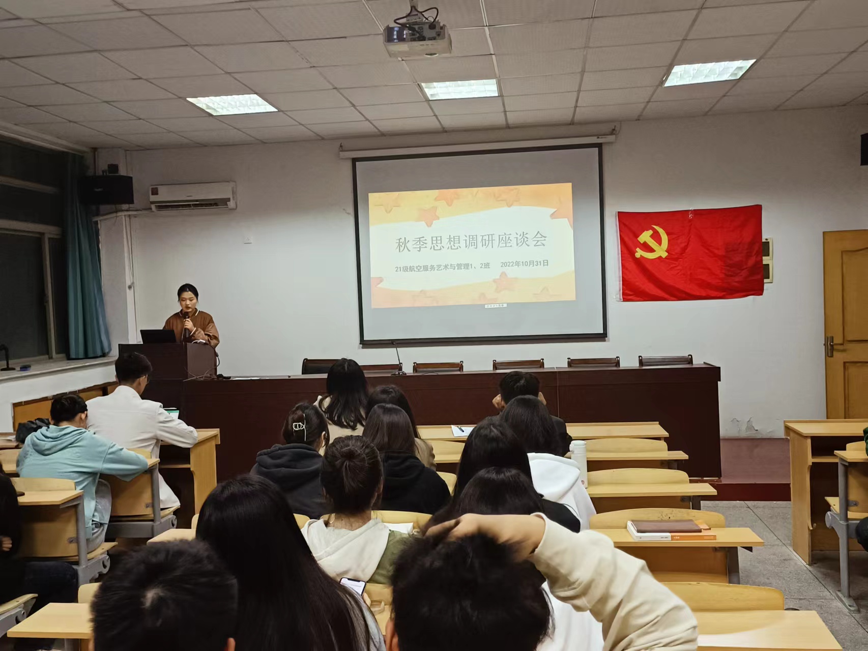 本网讯(文/李苗苗 图/刘春燕)10月31日晚上8点,2021级航空服务艺术与管理1、2班寝室长及员工代表在TapTap点点4楼会议室参加秋季思想调研座谈会,本会议由思政委员李苗苗主持,辅导员张雁参加。