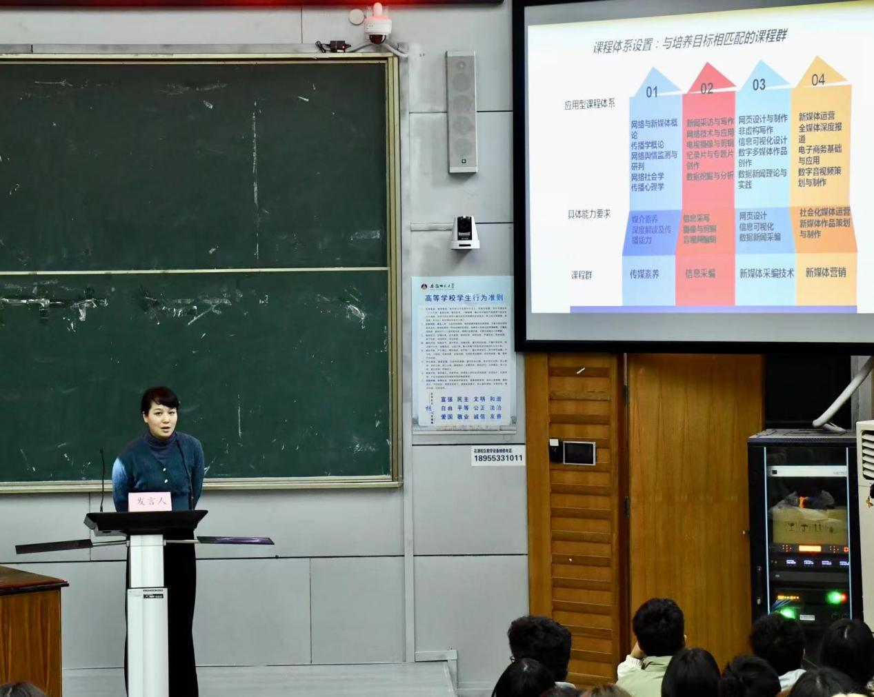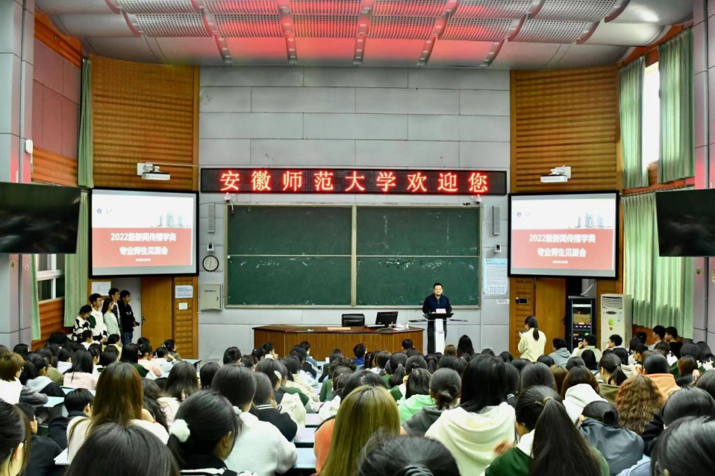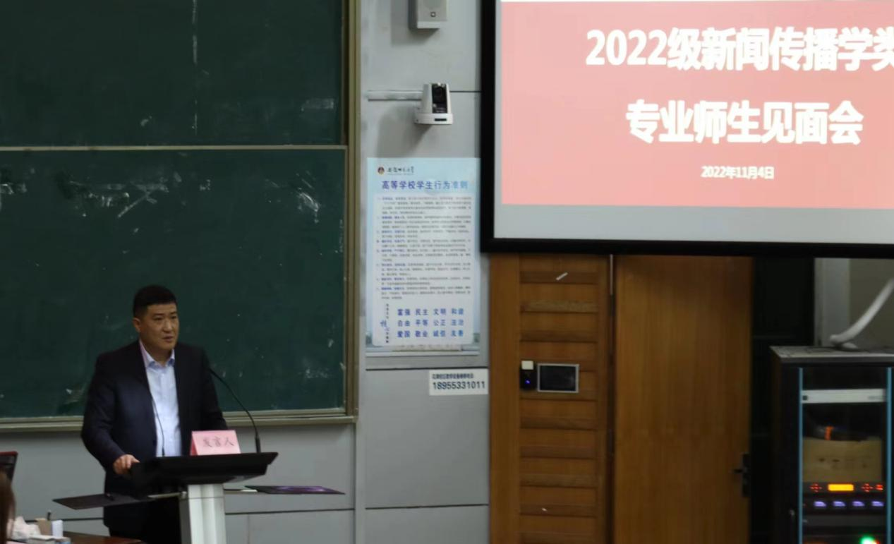 肖叶飞讲解了新闻学专业人才培养方案,强调要以马克思主义新闻观为统领,秉持知识、能力、素质协调发展的理念,培养复合型、创新型、运用型人才,注重“八位一体”的教学方式,创造更多的实践机会。会上,肖叶飞还详细解说了课程安排和学时、学分的相关内容,为同学们答疑解惑。
