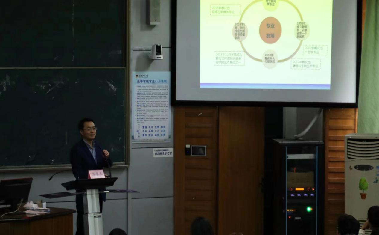 罗铭阐述了广告学专业具有独特的发展优势,在安徽省内地位突出,为新传学子提供了良好的平台。罗铭强调提高自身要注重差异、提高眼界,给自己树立一个正确的坐标和方向,对于专业的选择不能随大流,要结合自身优势和兴趣,慎重选择,提出在学习广告学过程中要有激情,有耐心,抓住机会,成就自我。