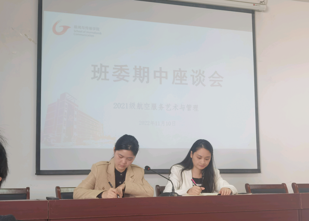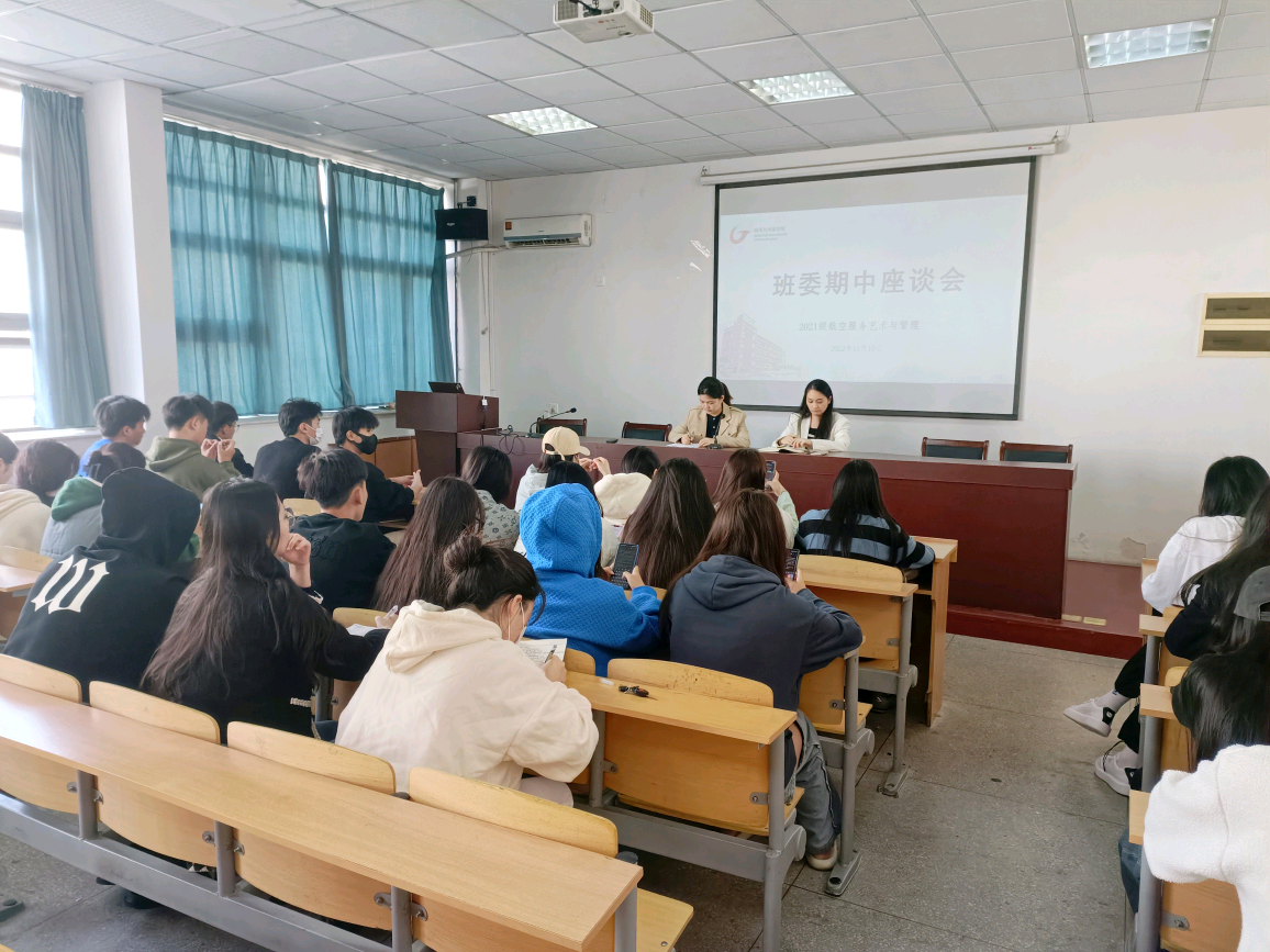 11月10日上午,2021级航空服务艺术与管理专业在院楼四楼会议室召开班委期中座谈会,座谈会由航空服务艺术与管理专业管委会主任王娟与生活辅导员俞应芬主持,所有班级班委参加。