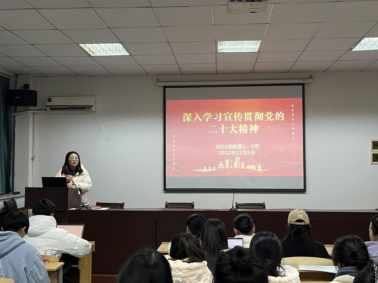 本网讯(21航服1、2班)12月5日晚上,航空1、2班召开党的二十大精神宣讲微团课,辅导员张雁主讲。