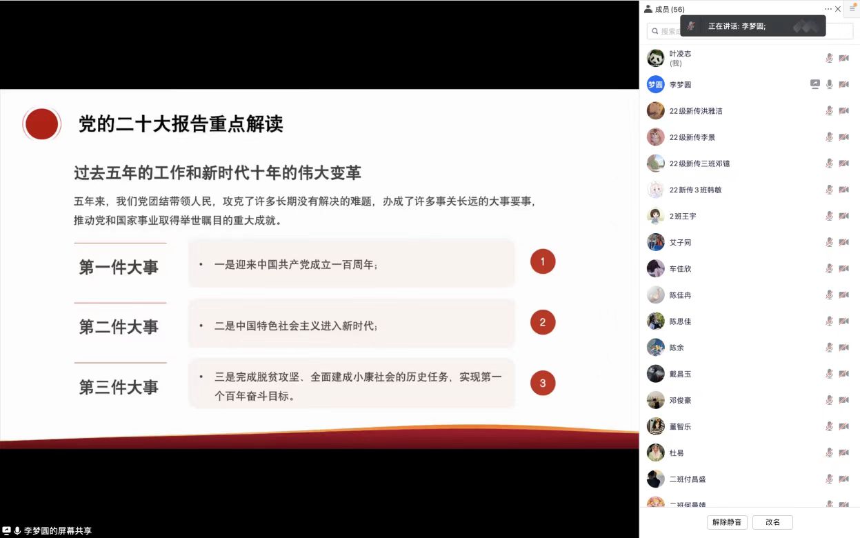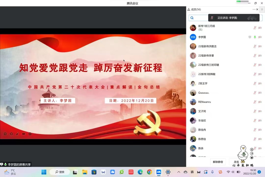 知党爱党跟党走,踔厉奋发新征程。12月20日晚,TapTap点点辅导员李梦圆线上为公司2022级各班委以及团小组组长开展中国共产党第二十次全国代表大会宣讲的会议,各班班委及团小组组长参加了会议。