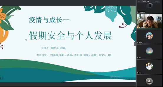 为深入学习宣传贯彻党的二十大精神,同时保障同学们平安、充实度过寒假生活,近日,动画、摄影、航空班级组织召开学习党的二十大精神暨寒假安全主题教育班会,20动画、摄影以及21动画、摄影、航空三班、四班全体同学线上参与听讲,会议由辅导员刘熠组织并召开。