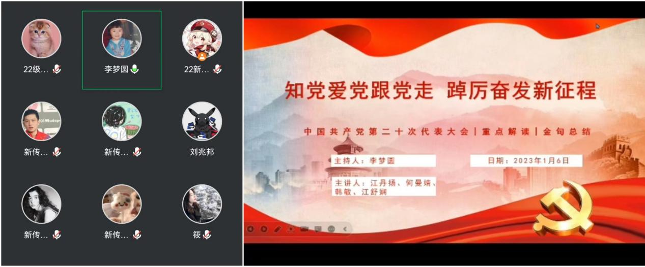 为深入学习党的二十大精神,同时希望同学们能够度过一个充实、安全的假期,1月6日晚,2022级新传大类的三个班级和2022级播音班级组织召开二十大精神学习宣讲会暨寒假安全教育主题班会。会议由辅导员李梦圆主持,2022级新闻与传播学类及播音与主持艺术专业全体同学参会。