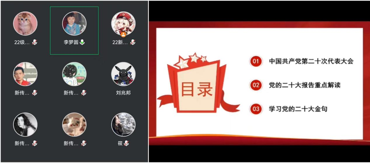 何曼婧从二十大的全称、议程、时间、主题等方面为同学们进行二十大的简单介绍,指出同学们需记住二十大的全称并对二十大主题进行了深入阐释,使同学们对于二十大有了初步了解和认识。江丹扬和江舒娴对二十大的重点内容进行解读;江丹扬对“高质量发展”和“科教兴国战略”进行了全面讲解,强调我们必须心怀“六个坚持”,江舒娴对“全过程人民民主”“全面依法治国”“社会主义文化”“增进民生福祉”等进行详细阐述;韩敏通过对二十大金句的阐释解读进行了会议的总结,用“党用伟大奋斗创造了百年伟业,也一定能用新的伟大奋斗创造新的伟业。”引出“我们作为当代老员工,该如何把学习党的二十大精神贯彻落实到我们的学习生活和实践中?”的问题并邀请了播音班班长叶凌志、新传一班班长张程宏、新传二班班长杨志远进行作答,以习近平总书记对青年的寄语结束了本次宣讲会。李梦圆对活动进行了总结,希望同学们能够深入学习宣传观察而党的二十大精神,希望通过团小组形式课后进行党的二十大精神学习研讨。