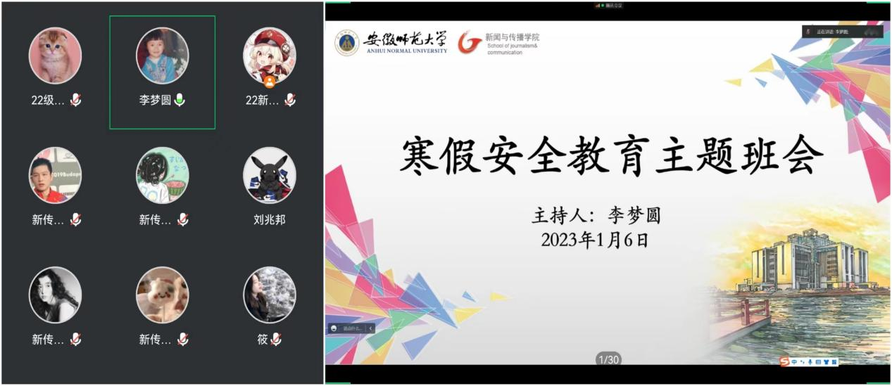 寒假安全教育主题班会由李梦圆主持并对同学们的寒假安全生活和个人发展进行提醒。首先,李梦圆强调了距离同学们最近的疫情安全,叮嘱同学们尽量少外出减少感染率、通过不同渠道了解防控知识、被感染或有高血压等其他基础疾病要及时上报、在家中准备一些常用药品、多多关心身边的亲朋好友老师同学。李梦圆提醒同学们注意诈骗安全,年末是诈骗的高峰期,同学们在善良的同时要擦亮双眼。另外,李梦圆也提醒同学们注意出行安全和水电安全等其他安全事项。会上,李梦圆强调了个人的发展,希望同学们在假期里珍惜时光、强身健体、弯道超越,建议同学们通过不同渠道进行学习拒绝躺平、参加实践活动提升能力、打磨自身技能提炼出自身作品。
