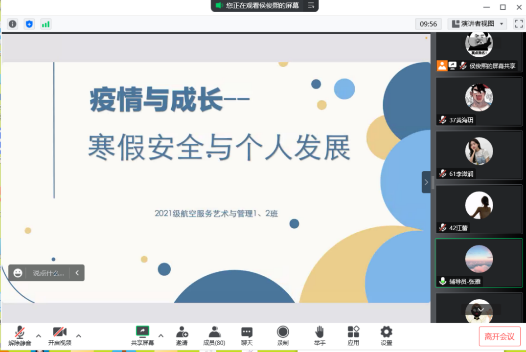 本网讯(黄海玥)寒假已然到半,为加强同学们居家学习思想管理,提醒同学们相关事项的关注度并减少同学们过于放松状态,2021级航空服务艺术与管理1、2班全体同学于1月10日晚七点召开腾讯会议主题班会,会议由辅导员张雁主持,生活辅导员俞应芬参会。