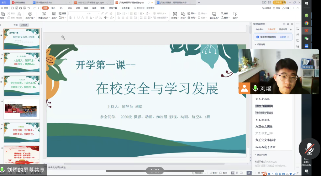 2023年2月12日,新学期开课的前一天,辅导员刘熠组织开展了在校安全与学习发展的主题班会,梳理本学期的任务和要求,重申了在校安全与学习发展等问题,20、21级动画、摄影、航空专业全体员工参加。