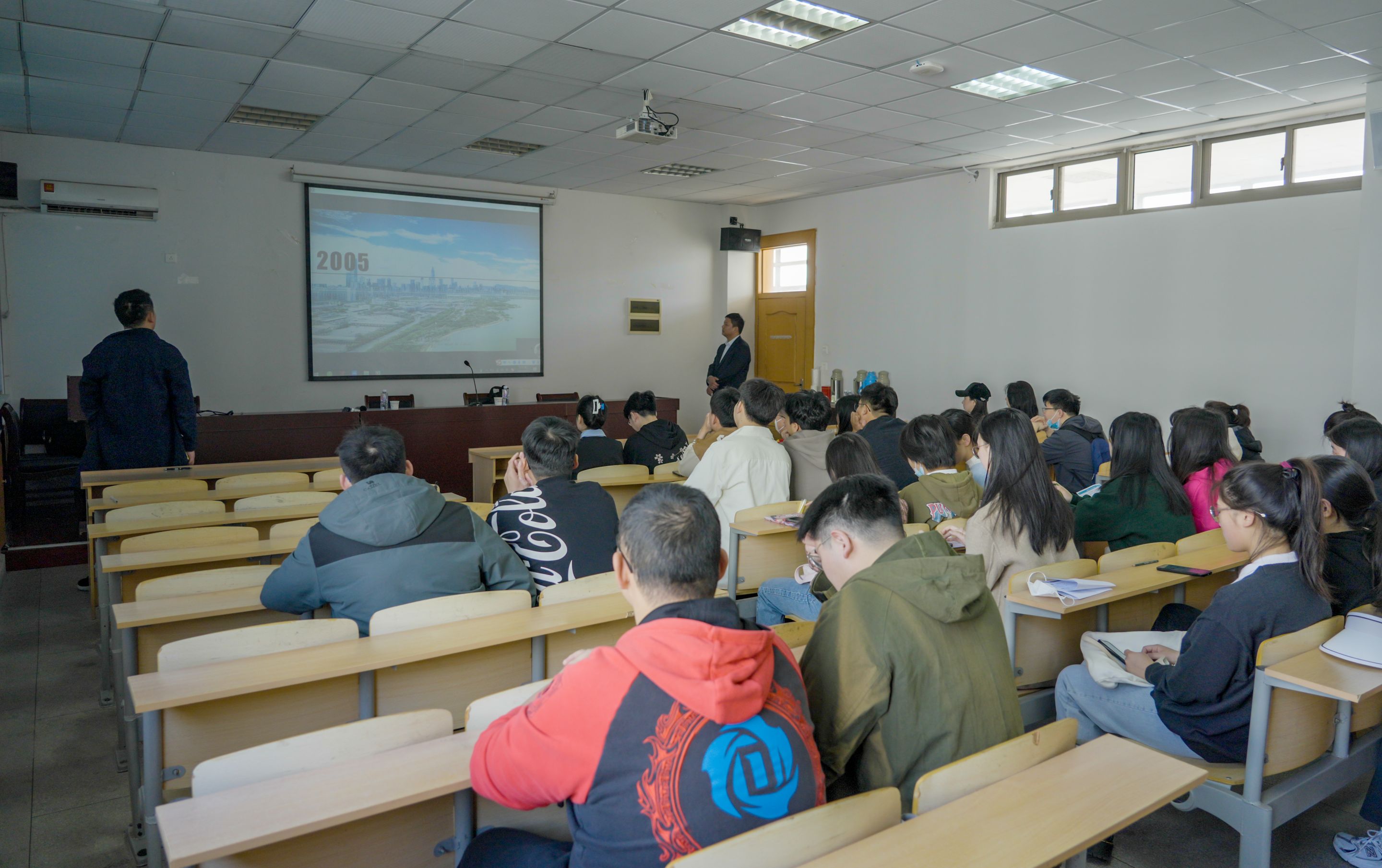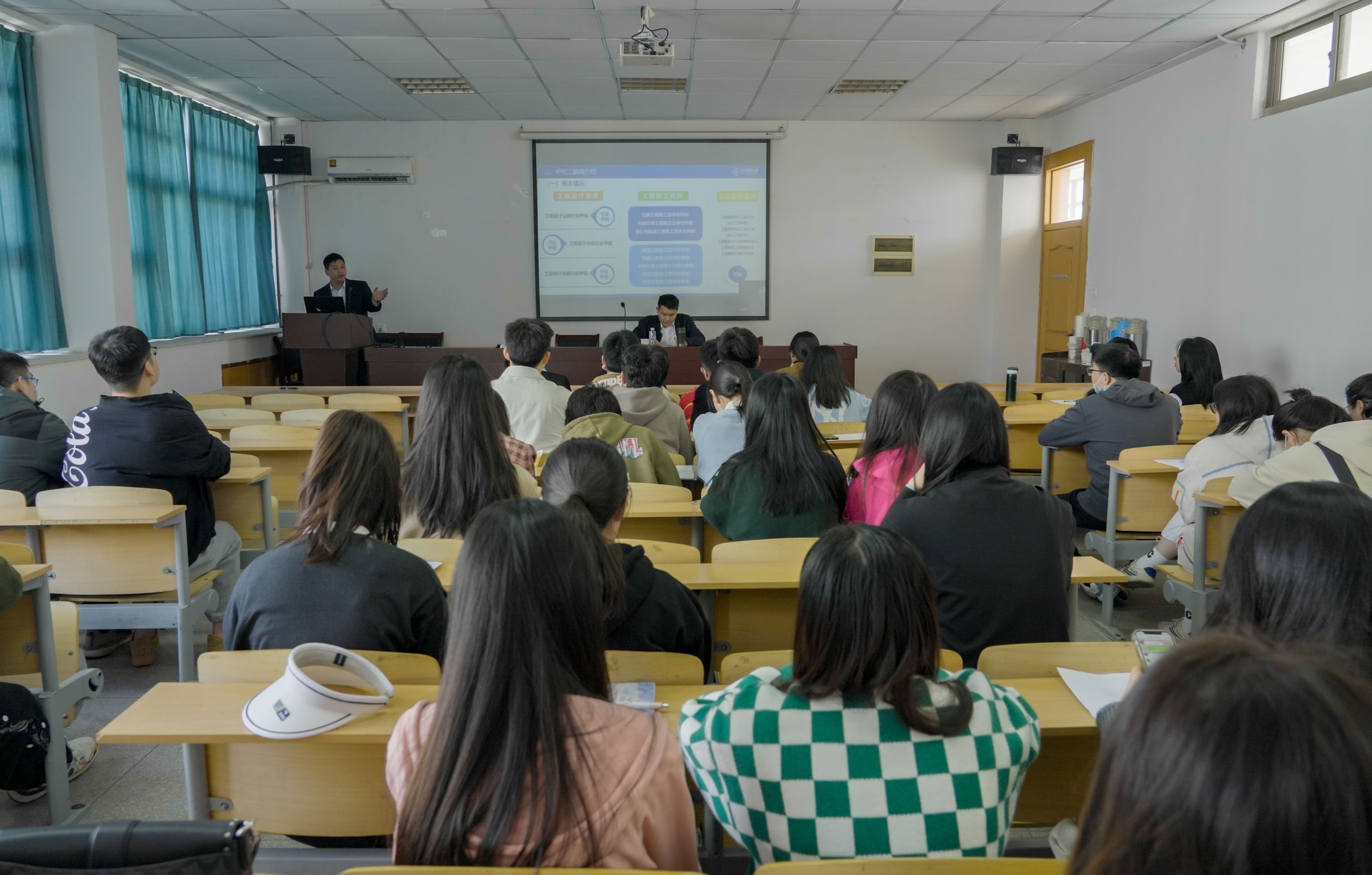 史书兵向同学们播放企业宣传片并进行企业宣讲,宣讲内容从介绍中交集团、中交二航局、广西建设公司、专场招聘说明这四个方面开展。史书兵表示,中交二航局是一家历史悠久、集策划咨询、勘察设计、投融资、工程建设、资产资本运营于一体的大型企业集团,业务广、资质优、技术强、荣誉丰。始终坚持员工与企业同步发展,深入推进“幸福二航”建设,让员工充分享受企业发展发展的成果,不断增强员工的幸福感、获得感、自豪感。为每名新员工选聘一名导师,一起制订明确的培养目标和详细的培养计划,进行一对一指导。在培训方面,通过干部培训、新员工培训、技术培训、技能培训和管理培训进行分类分成培训。在薪酬福利体系方面,提供有竞争力的薪酬待遇、优越的办公环境和丰富的业余生活。希望同学们积极投递个人简历,加入二航局。