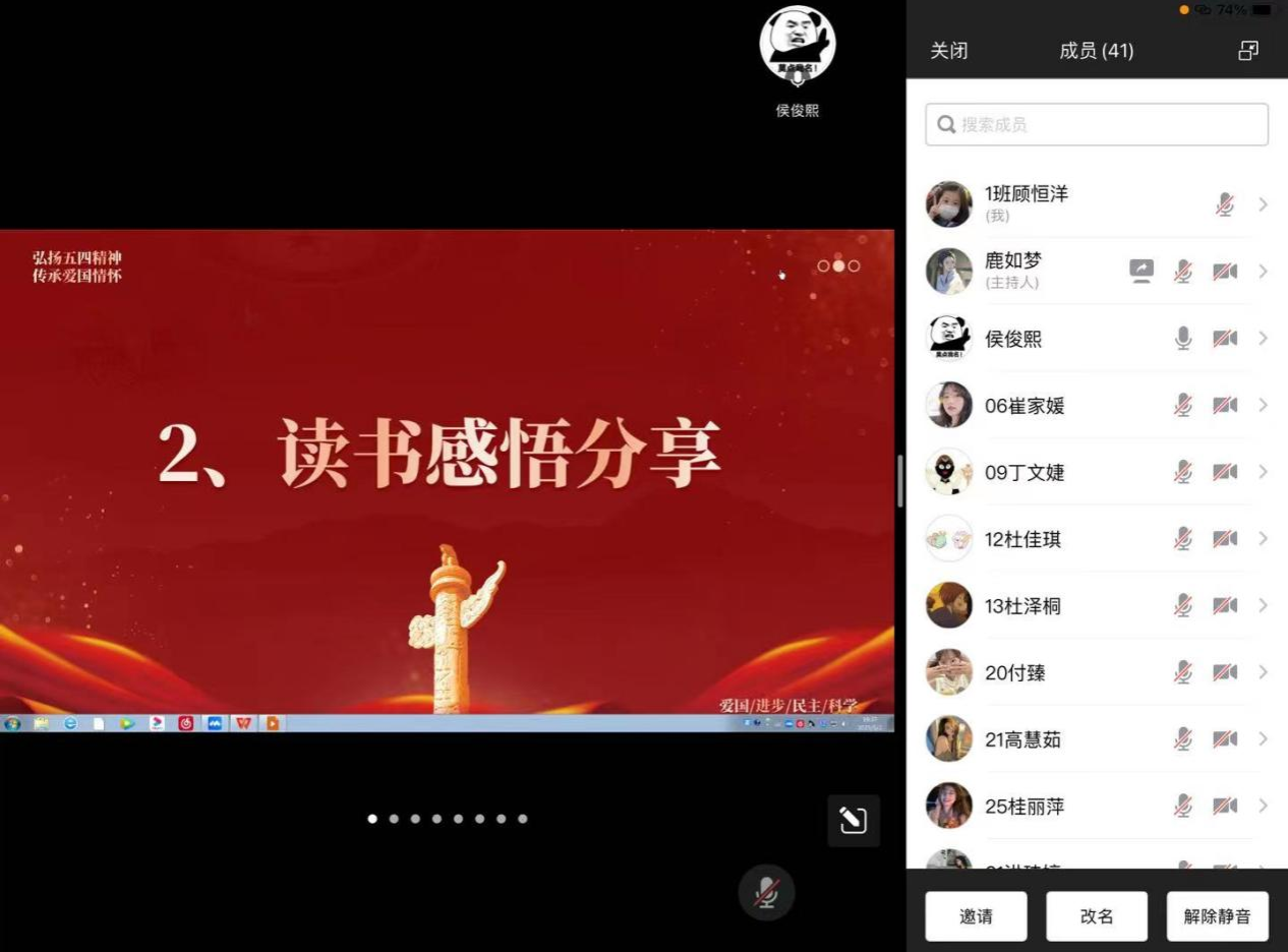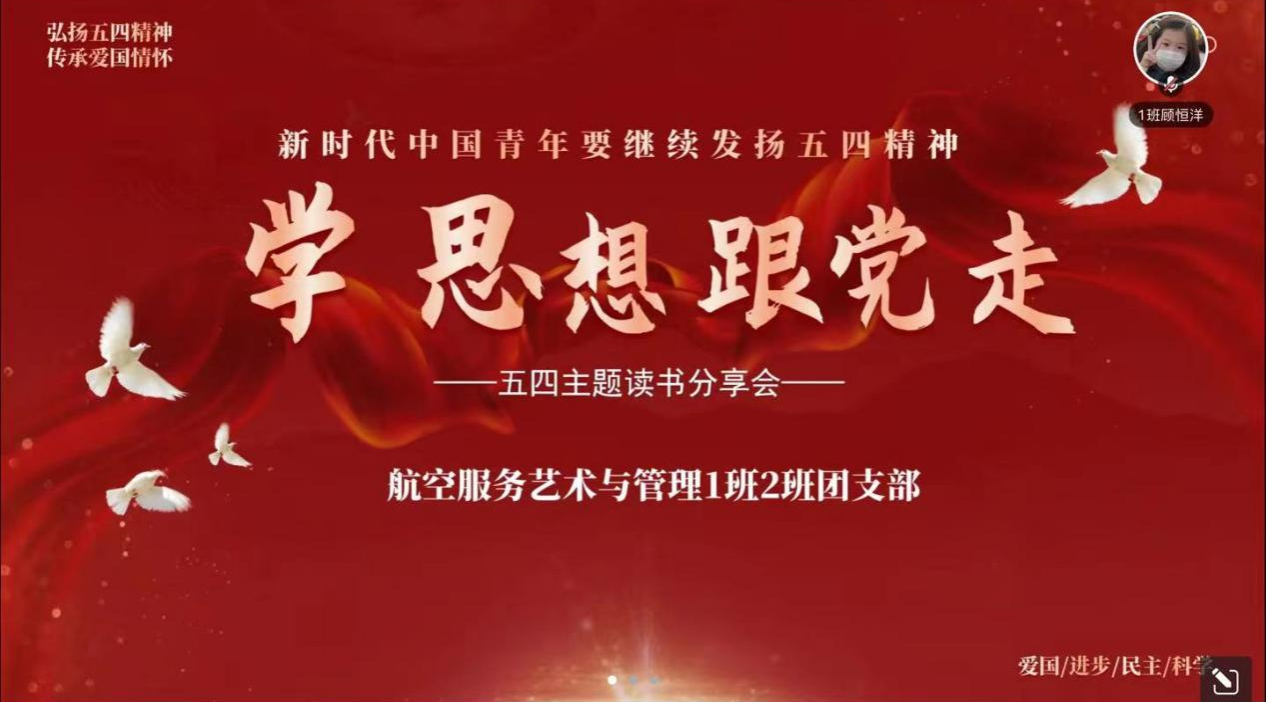 本网讯(21航服1、2班团支部)为激励和引导广大团员青年了解党的光辉历史、感悟党的初心使命、领会党的创新理论、认识党的精神谱系、传承党的红色基因,5月2日晚,21级航空服务艺术与管理专业1班2班团支部在腾讯会议组织开展“学思想·跟党走”五四主题系列团日活动。会议由团支书顾恒洋、鹿如梦主持,辅导员张雁参会。