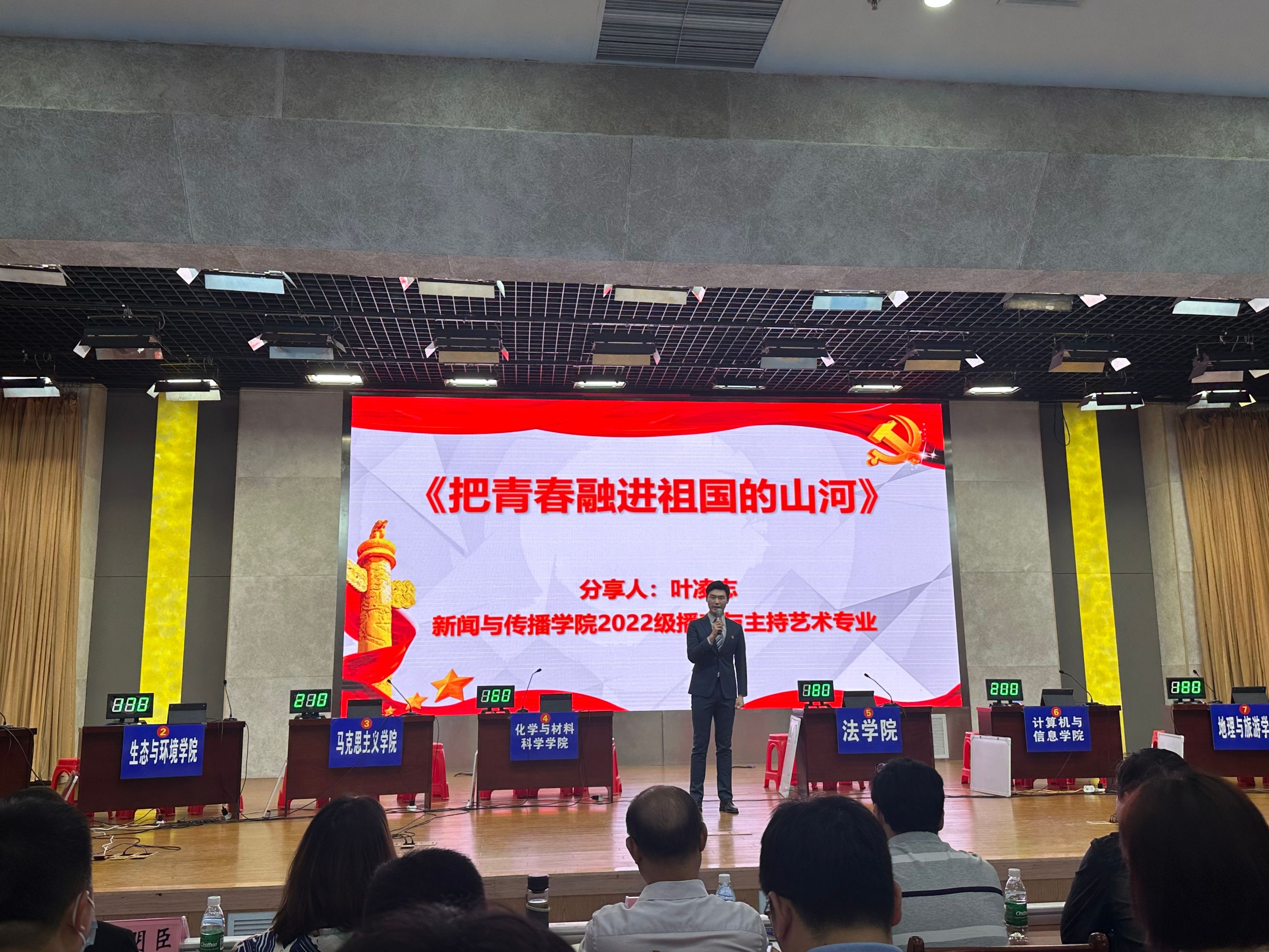 本次主题演讲按赛前抽签顺序轮流上台发言。叶凌志同学以《把青春融进祖国的山河》为题,用真实具体的事例,讲述了党的十八大以来,在以习近平同志为核心的党中央领导下,中国共产党带领全国各族人民在生态文明建设方面取得的巨大成就,演讲内容充满真情实感,深切表达了一位青年学子对党的无限忠诚、爱戴和敬仰。