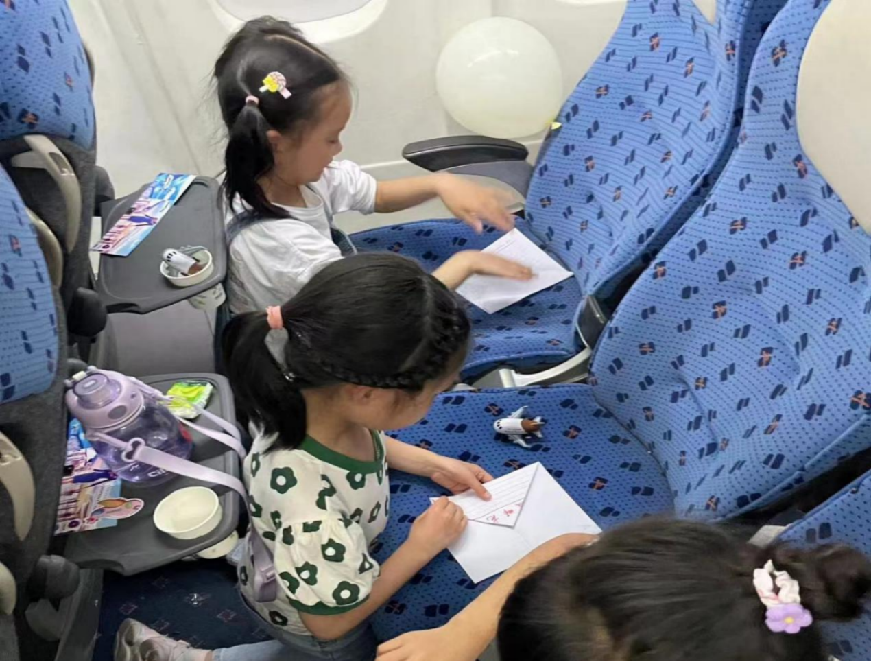 在互动分享环节中,小朋友们争先恐后的发言,有的说“原来坐飞机这么有意思”、有的说“原来检查小桌板有没有放好这么重要啊”“还需要把座椅靠背调直”。等解答完孩子们的问题,与他们交流后,同学们为小朋友们准备了精美的小礼品,为增强小朋友们的体验感,在最后设置了纸飞机大赛环节,孩子们根据个人知识不断改进自己的纸飞机作品,力求纸飞机飞的更高、更远。