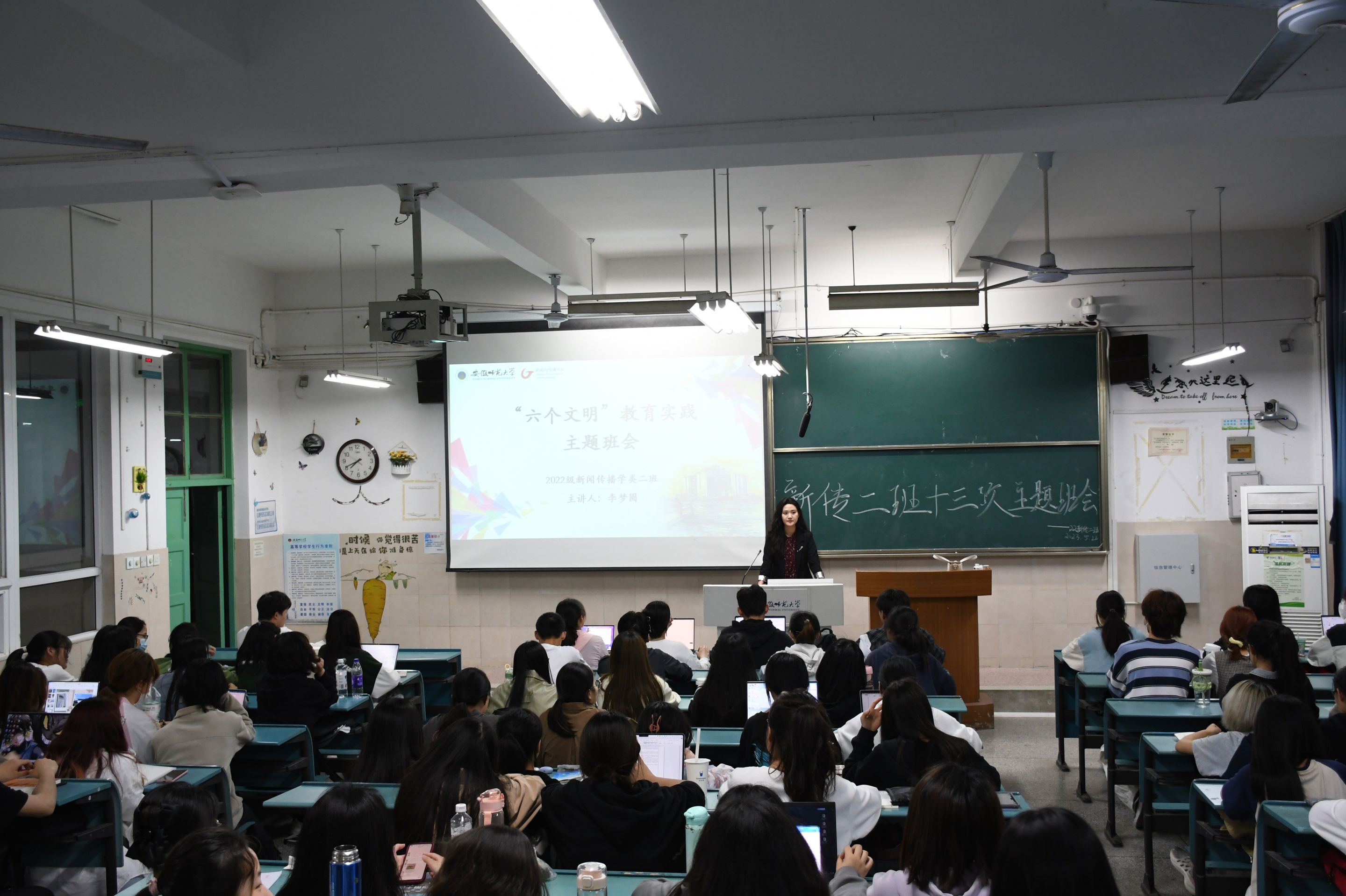 为了推动校园文明建设,营造上下联动、全校师生共同参与的氛围,争做文明风尚的传播者、实践者和推动者。22新传大类二班全体同学在辅导员李梦圆的带领下开展了“六个文明”教育实践主题班会,深入学习了老员工文明教育的内涵。