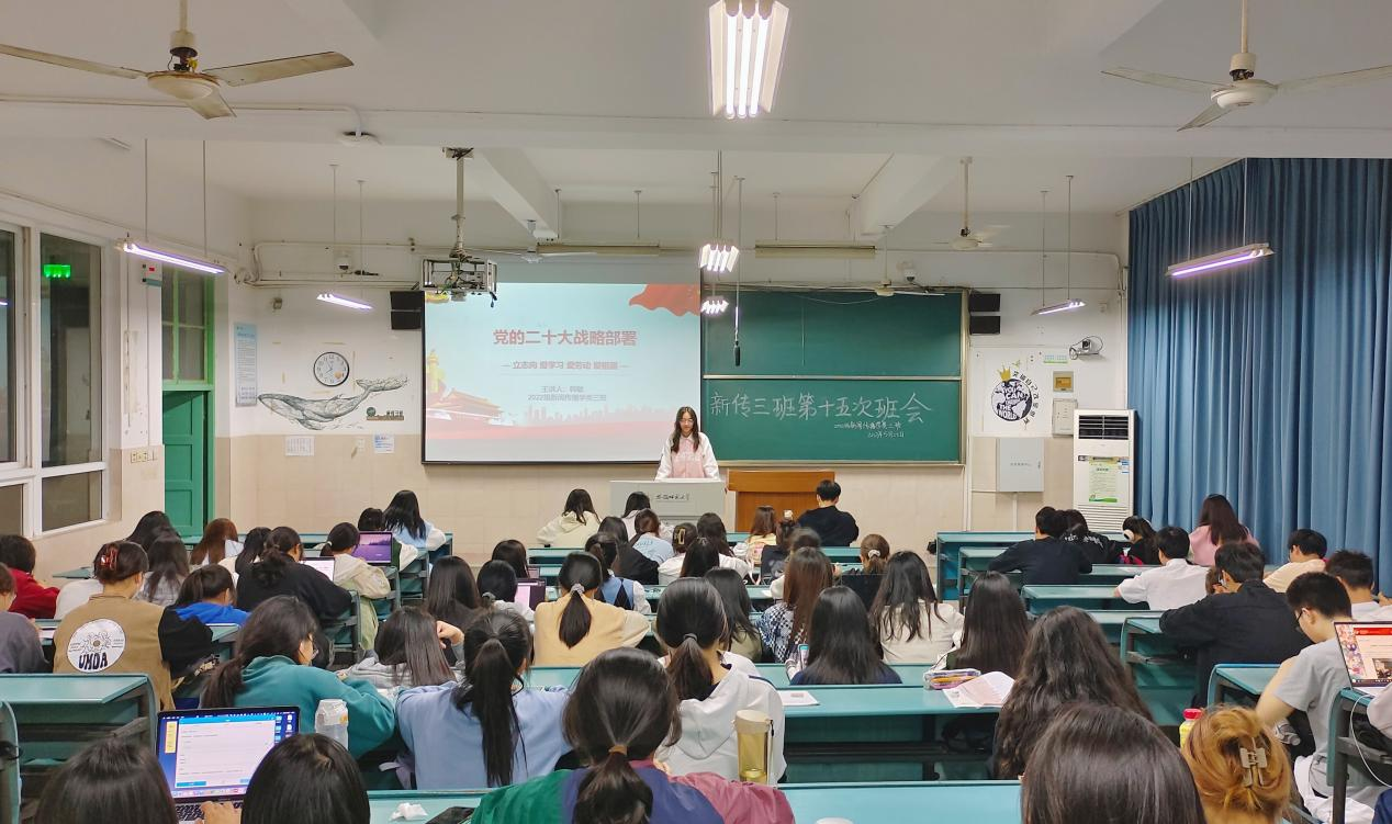 班会主讲人韩敏以党的二十大战略部署为主题,从“战略部署主要内容”“二十大精神”“我们应该如何做”三个板块进行阐述。在“战略部署主要内容”中提出推动高质量发展应坚持加快构建新发展格局,坚定实施创新驱动发展战略,向创新要动力,构建高水平社会主义市场经济体制,向改革要活力,全面推进乡村振兴,着力推进区域协调发展以及推进高水平对外开放。