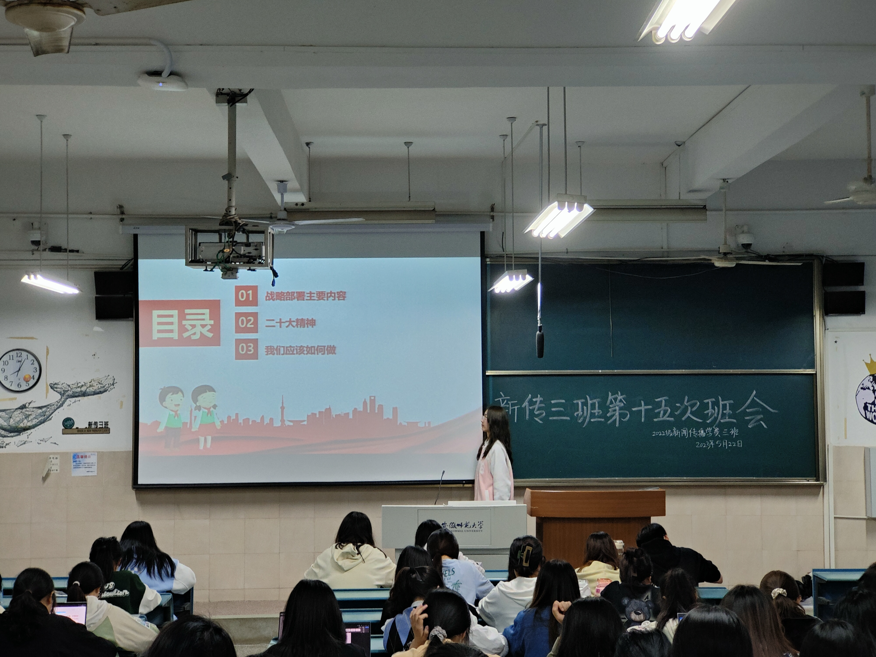 2023年5月21日晚上8点,新闻传播专业大类三班在2050304教室开展第十五次班会,主讲人班团支书韩敏,班会由班长廖兴主持,2022级新闻传播学类三班全体员工参加。