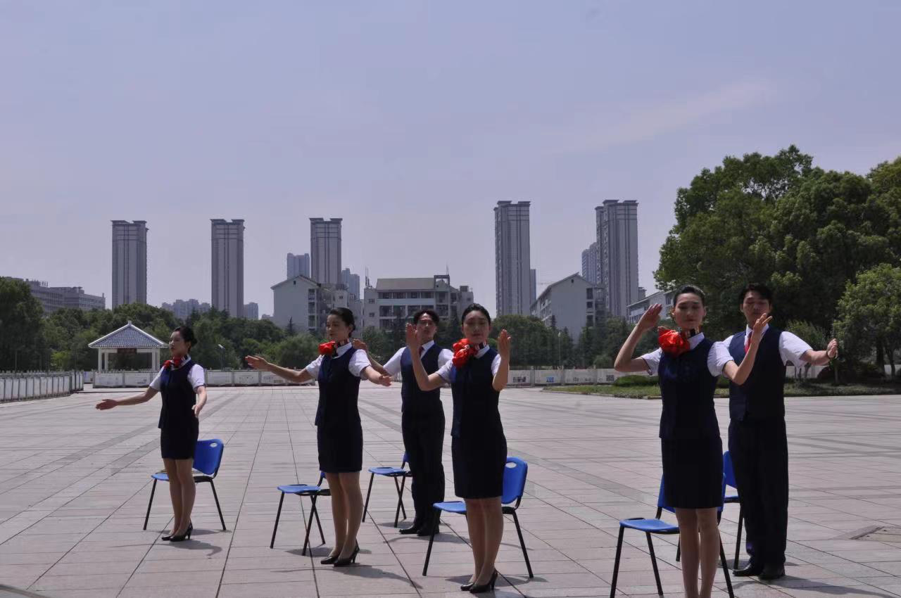5月19日下午14:00,接待组的值机人员在模拟舱入口处为到达现场的同学们分发登机牌,同学们化身乘客进入现场。在乘务组的带领下,乘客们有序入座。活动第一项是礼仪操展示,航服一班的同学们面带微笑、动作流畅、神态自然、举止大方,将空乘人员待人接物的站姿、坐姿、蹲姿等职场礼仪用简单清晰的动作进行了呈现。