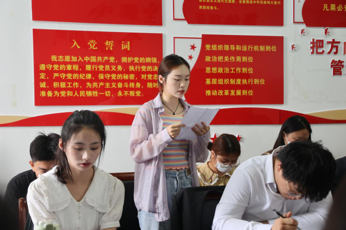 会上开展了讨论接收徐雨晴等8名发展对象成为预备党员的工作。8名发展对象向大会汇报了自己的入党动机、对党的理解及认识、个人履历和家庭主要社会关系,同时结合自身实际情况表明了加入中国共产党的决心。支部书记与入党介绍人向大会分别介绍了发展对象的主要情况,并逐一对其能否入党表明意见。同时纪检委员李露露向大会逐一报告了对申请人培养过程、审查情况。随后,与会党员对申请人能否入党进行讨论并发表意见,经与会正式党员无记名投票表决,同意接收徐雨晴等8名发展对象为中共预备党员。最后,8位发展对象表态,吸取意见和建议,努力改正不足,将严格遵守党的章程,以身作则。