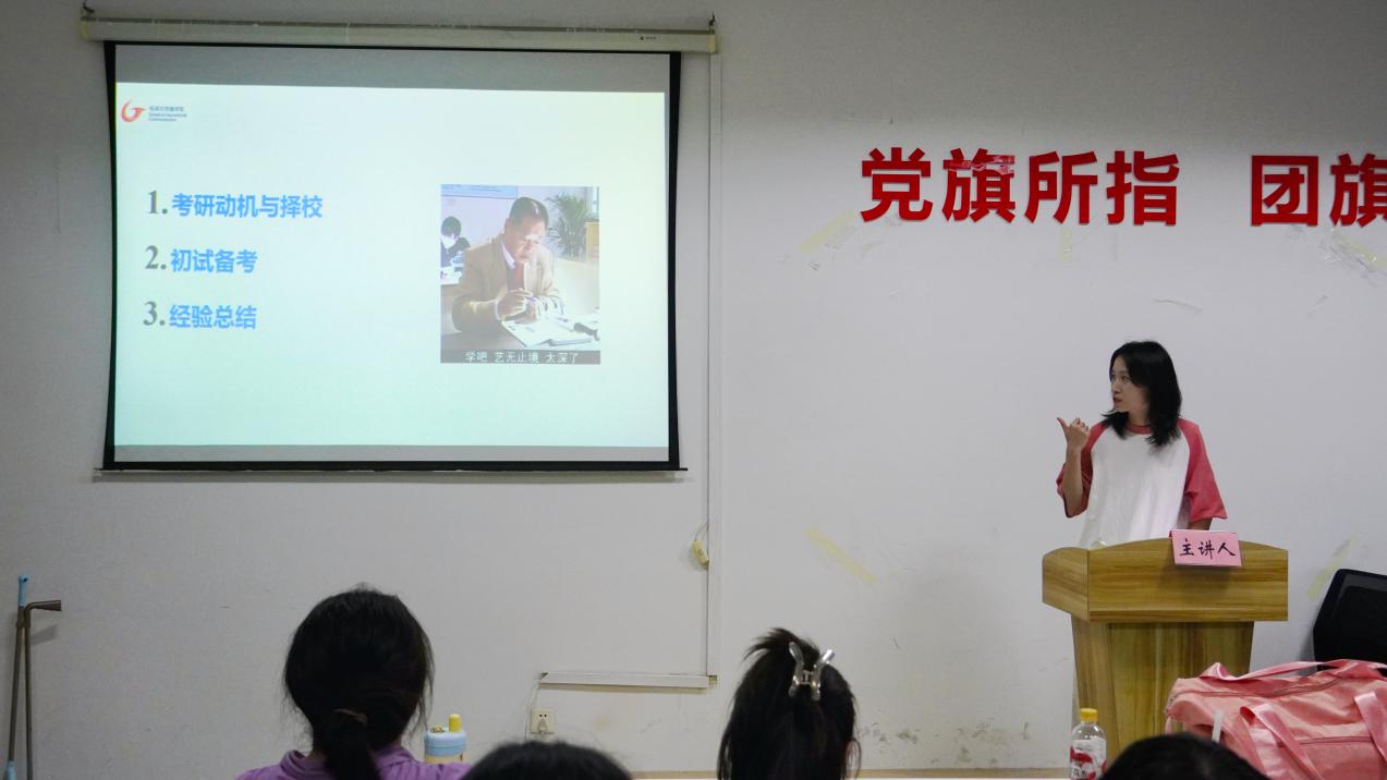 黄宝仪就自己的跨专业考研经验进行分享。她结合自己的亲身经历,从题型做法、分配时间等角度系统介绍英语学习的过程与方法。黄宝仪说:“考研中不要做性价比过低的努力,就像英语阅读5分一个,我们就要牢牢把握住,而翻译则可以小小放松一下。”此外,关于专业课的备考,她表示,考研是一个长期的过程,同学们要把握好自己的学习节奏,稳步前进。