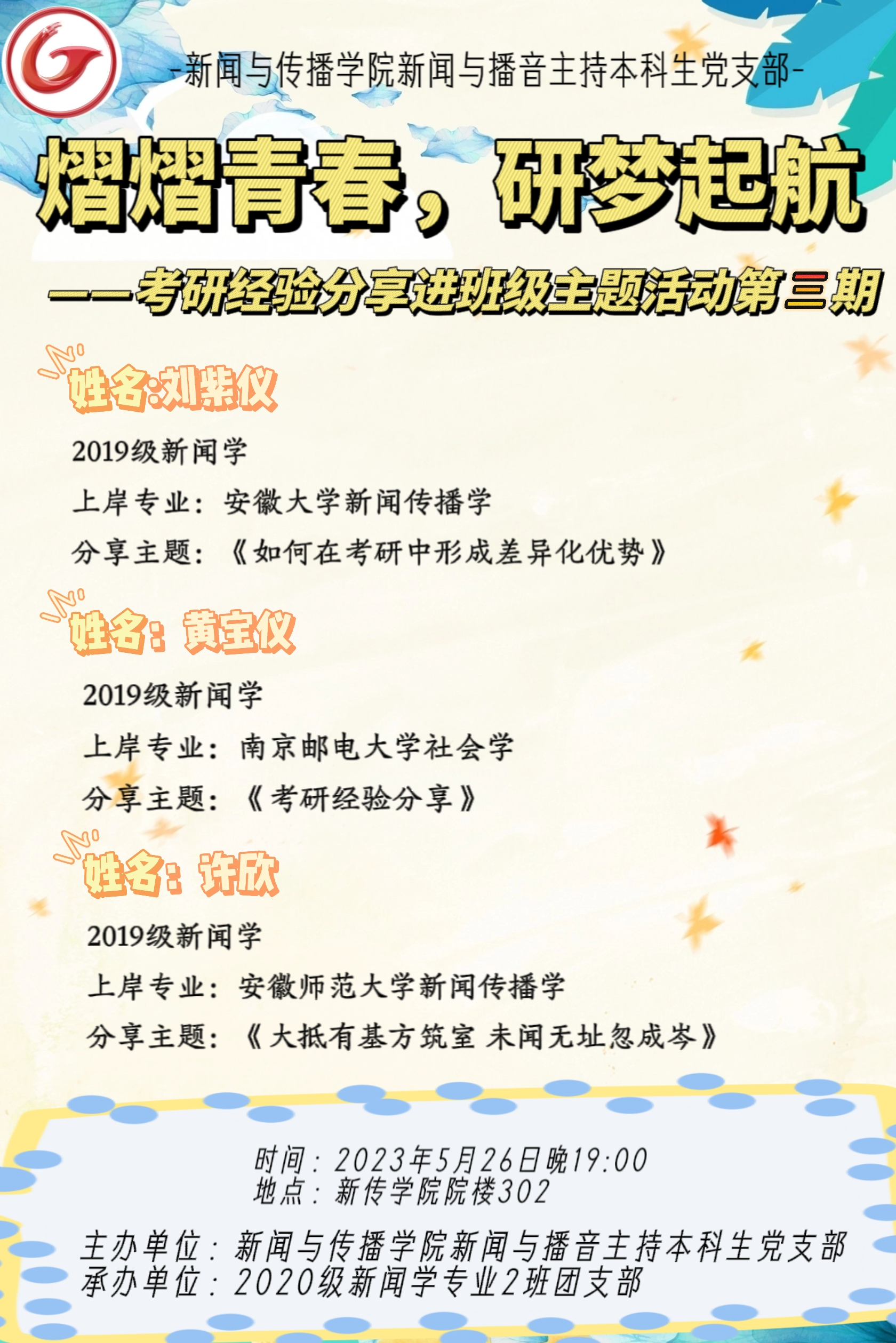 为进一步做好主题教育,加强班级学风建设,5月26日晚7点,由新闻与播音主持本科生党支部主办、新闻学专业2020级2班团支部承办的考研经验分享第三期活动在TapTap点点院楼302成功开展。本次活动由2019级新闻学专业的刘紫仪、黄宝仪、许欣进行经验分享,2020级新闻2班全体同学参与。