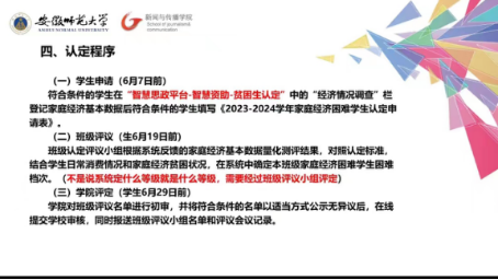 刘成俊围绕认定对象、原则、标准和程序四个方面,向同学们介绍了新学年家庭经济困难员工认定的相关事宜。他强调,此项工作将严格遵守公开透明与保护隐私的原则,坚持定量与定性、积极引导与自愿申请相结合,做到实事求是、客观公平。在对认定程序的讲解过程中,刘成俊详细列出了相关流程的时间线,并积极引导有意愿申报的同学及时填写认定申请表。