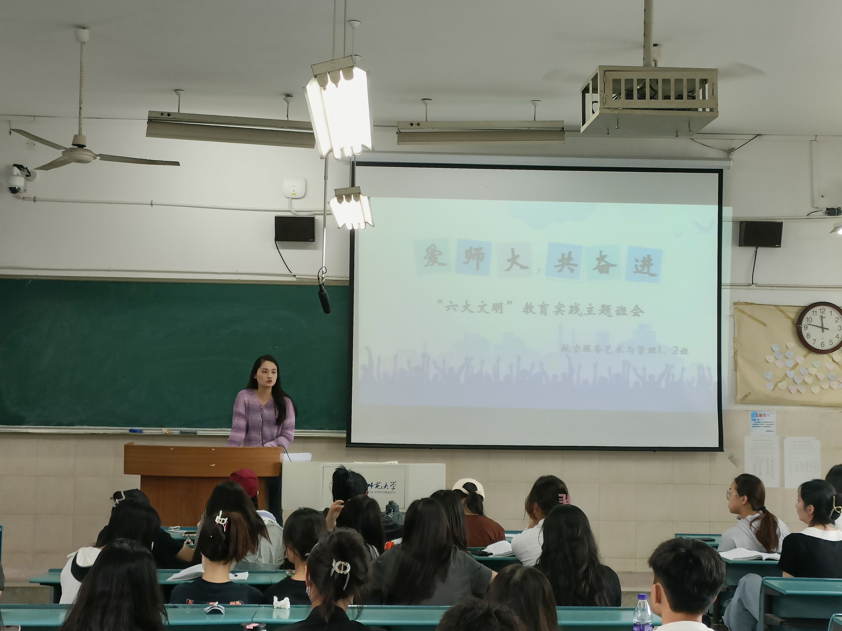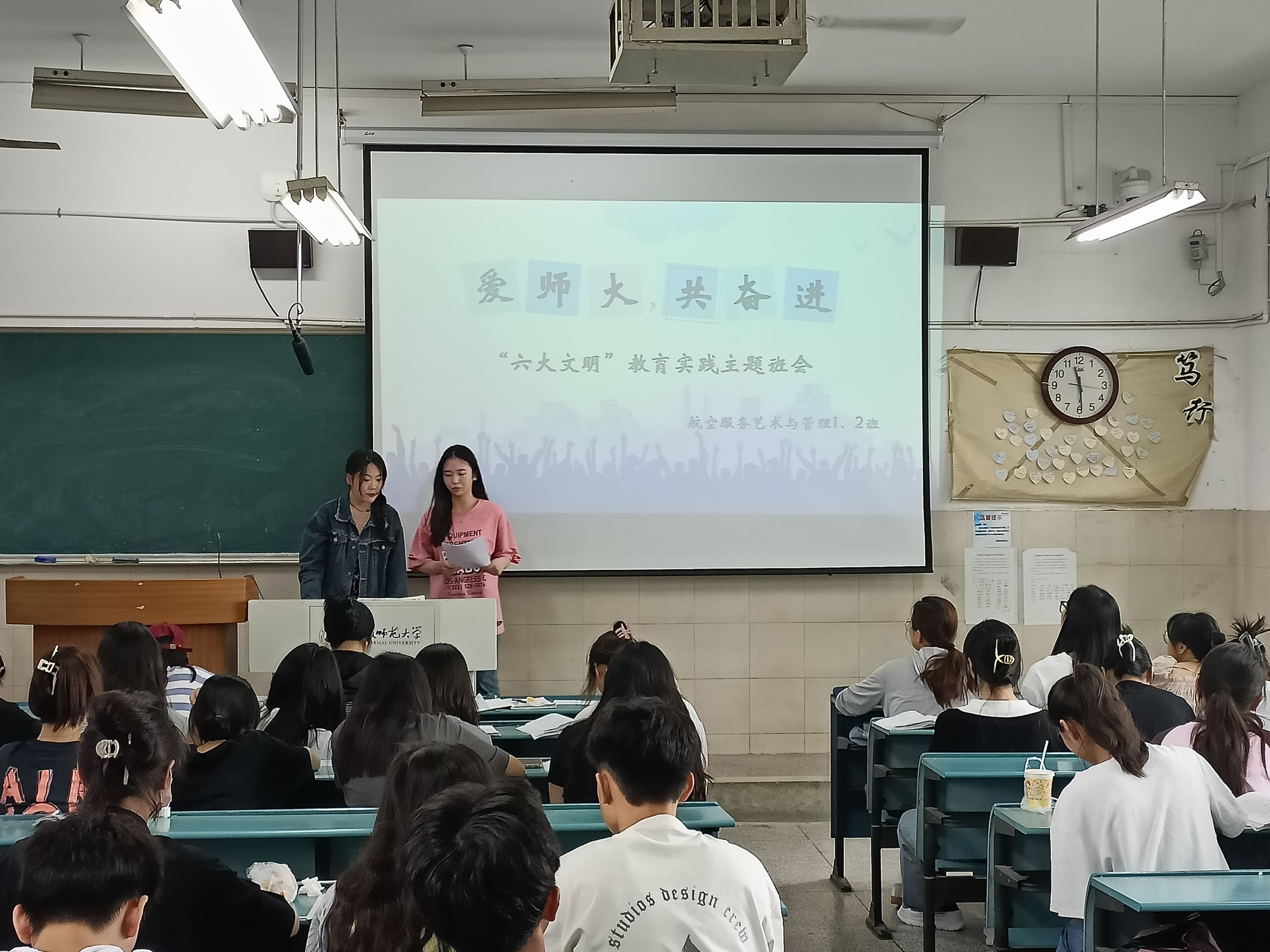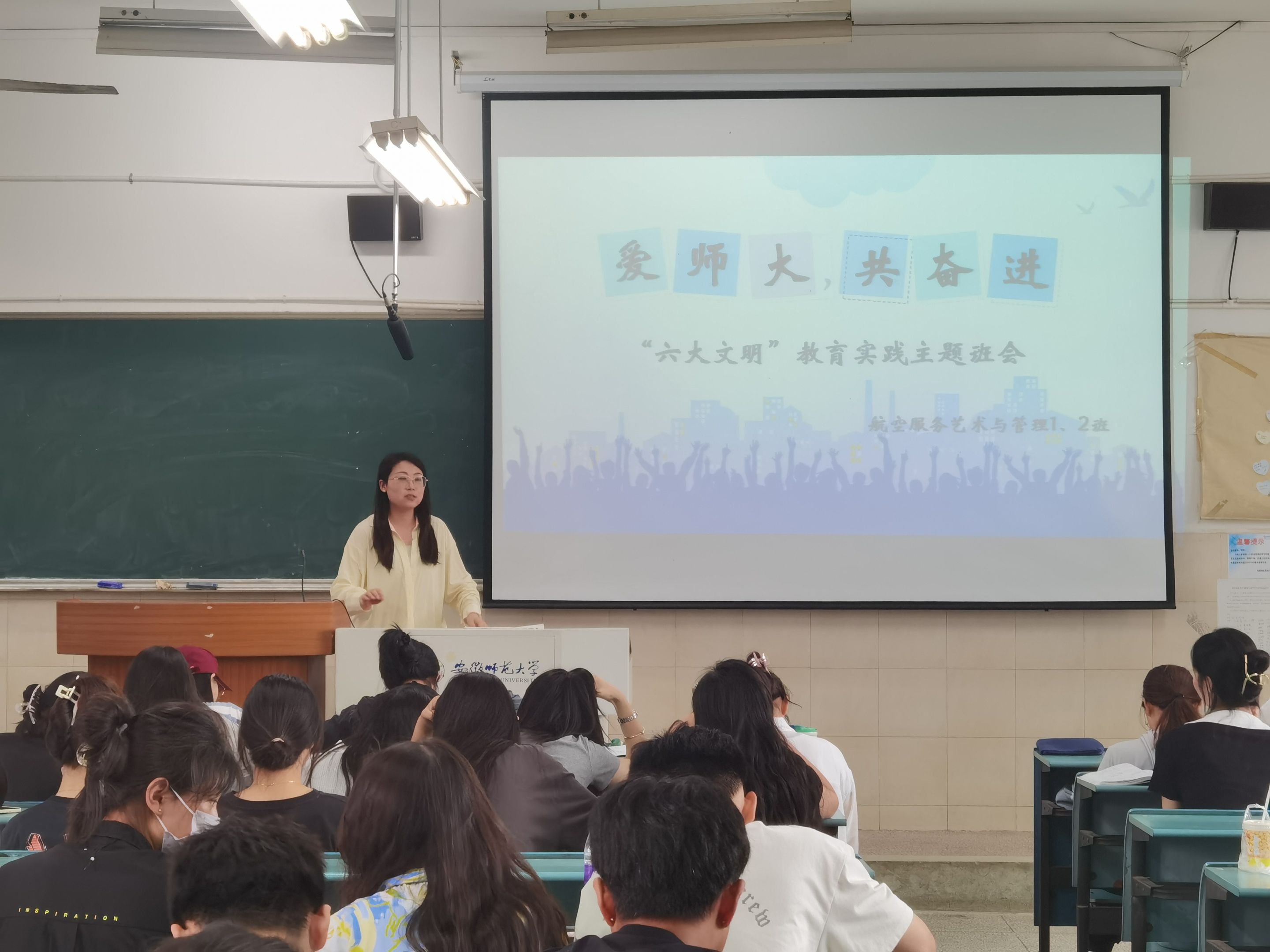 (本网讯 文/刘春燕 图/刘春燕)为共同构建文明校园,培养老员工的文明行为,6月7日,21航服务1、2班开展了“爱师大,共奋进·六个文明”教育实践主题班会,本次会议由安全委员刘亚南、丁文捷主持,1、2班全体同学参加,辅导员张雁、俞应芬参会。