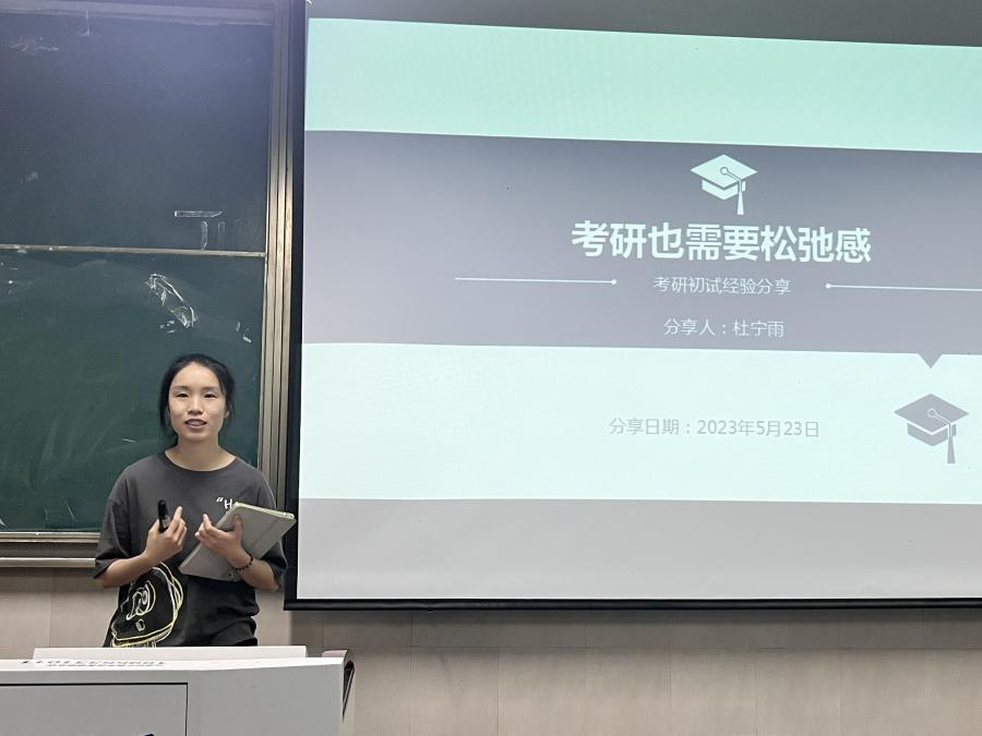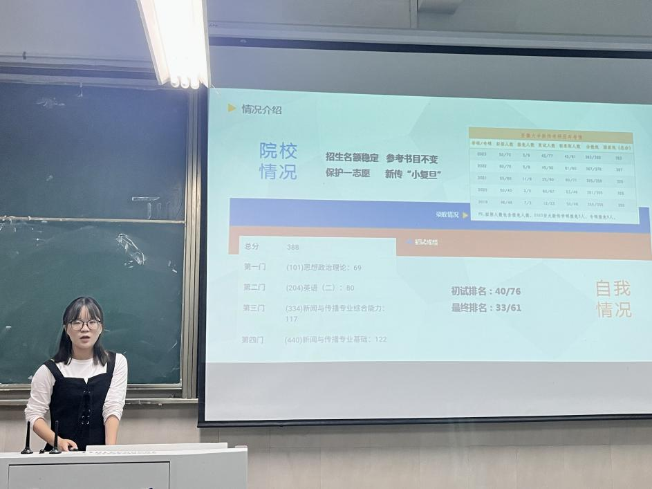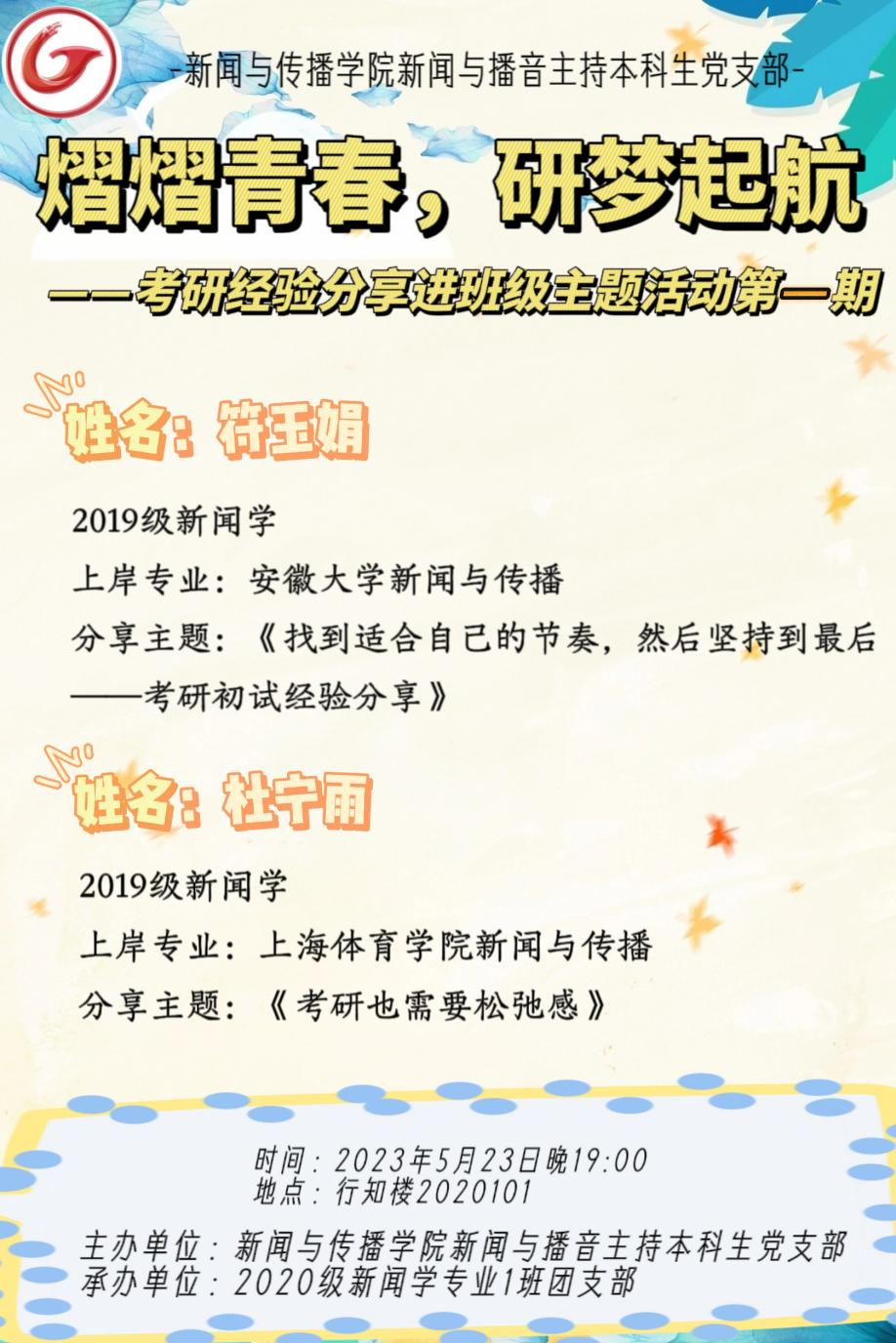 本网讯(文/丁嘉仪 图/王玉敏)为进一步做实主题教育,加强党员同学服务带动和引领作用发挥,加深意向考研员工对考研的认识和了解。5月23日晚7点,由2020级新闻学1班团支部承办的考研经验分享进班级活动第一期在行知楼2020101教室举行。活动由20新闻1班团支部书记丁嘉仪主持。本次活动中,本团支部邀请了2019级新闻学专业的符玉娟和杜宁雨做考研经验分享,专业辅导员梁嘉参加活动。