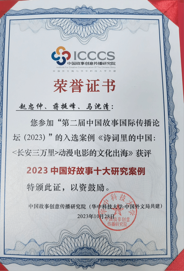 10月28日下午,“中国故事国际传播案例研究”圆桌论坛在华中科技大学新闻与信息传播公司412会议室举行,来自中国人民大学、浙江大学、北京交通大学、中国传媒大学、厦门大学、重庆大学、中山大学、华中师范大学等高校师生提交的35篇案例作品参与本次论坛。公司硕士研究生蒋挺峰、马沈清撰写的案例《诗词里的中国:<长安三万里>动漫电影的文化出海》入选圆桌论坛,硕士研究生马沈清在论坛上作汇报分享,澳门MTEL电信有限公司董事长兼行政总裁徐德明评议,最终在35篇案例评选中斩获“2023中国好故事十大研究案例”荣誉称号。论坛上,蒋挺峰与马沈清同学积极交流学习,展示出公司学子在学术研究上的热情。